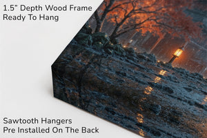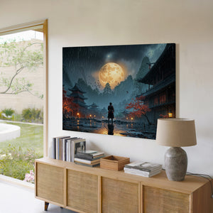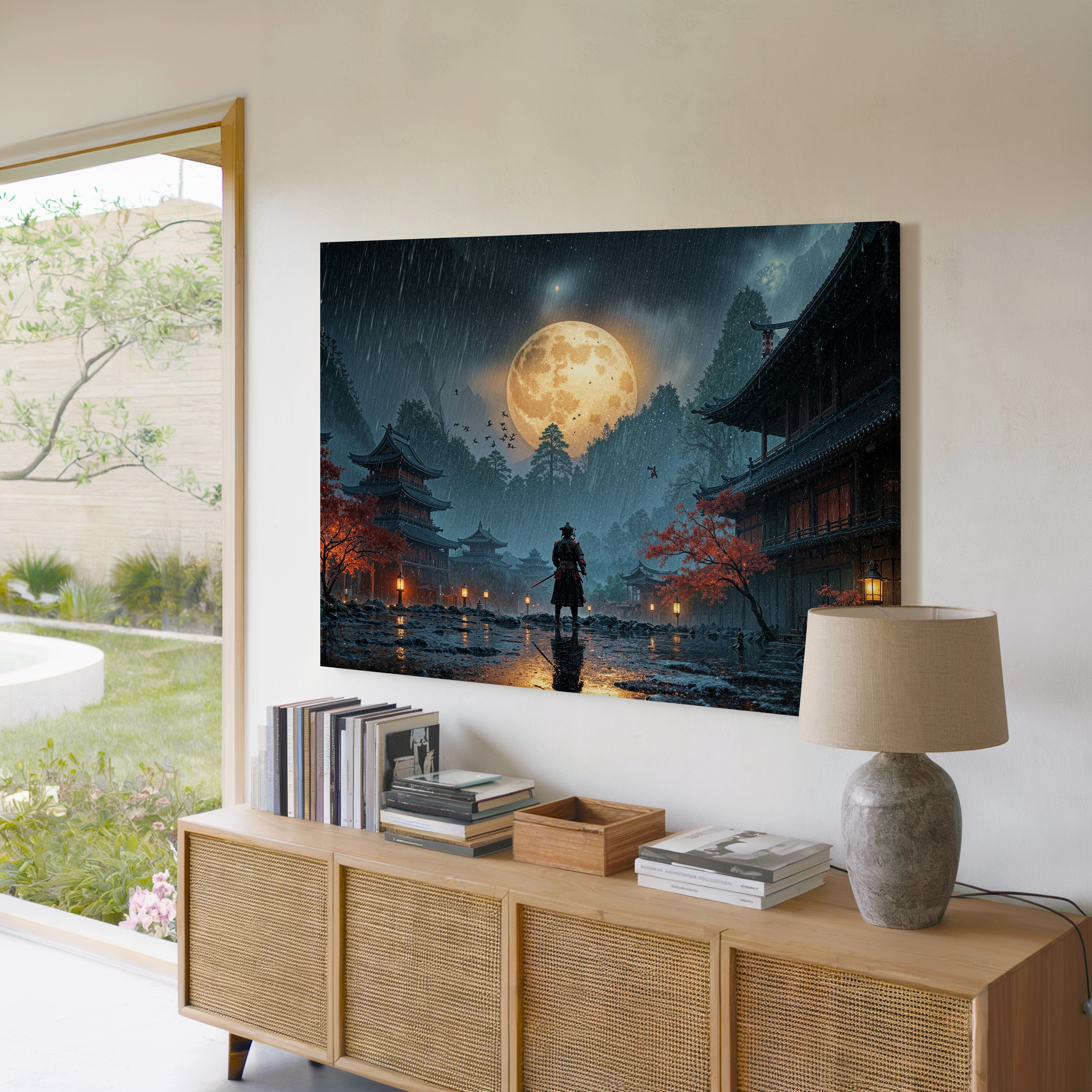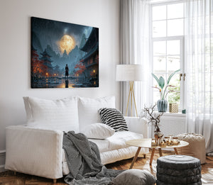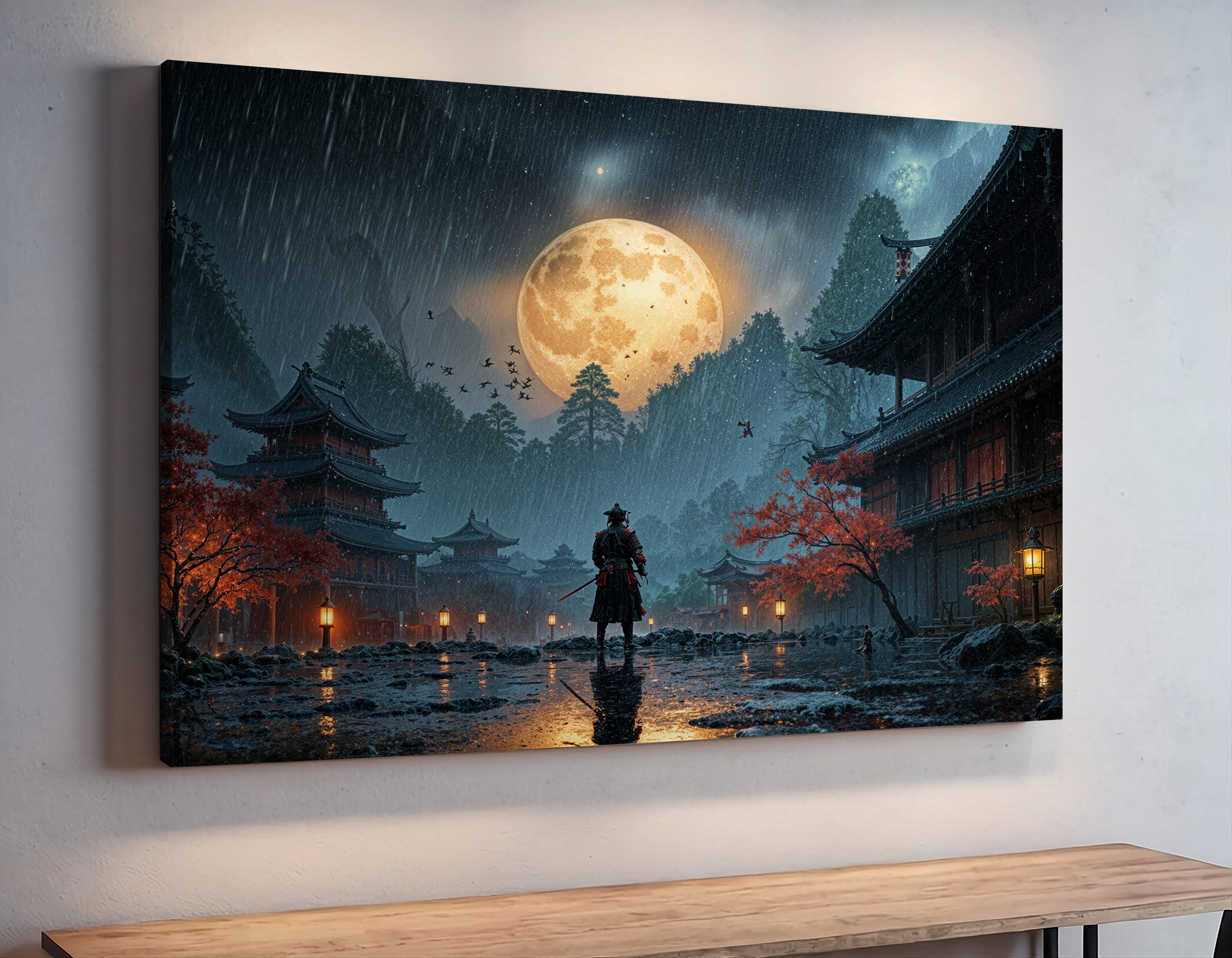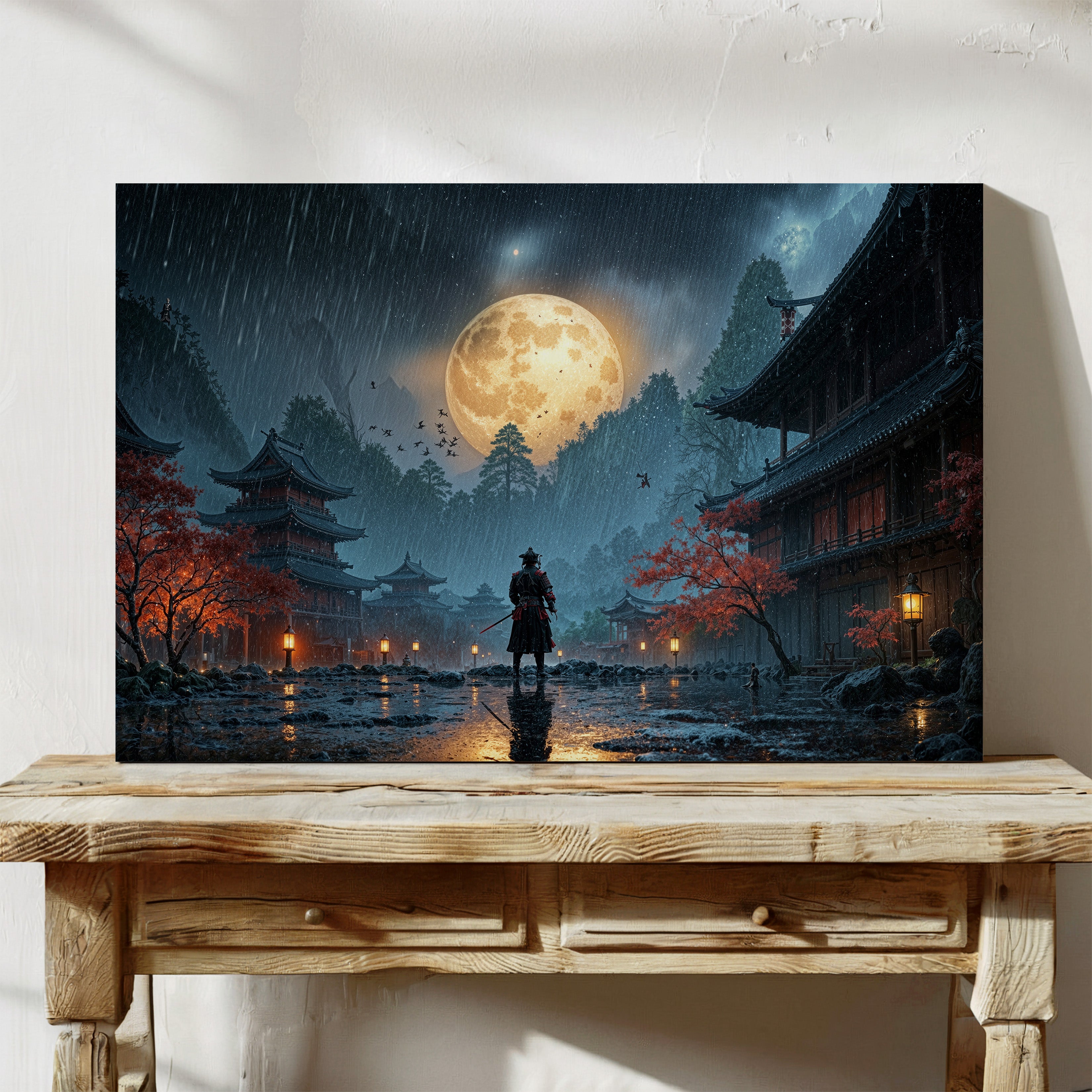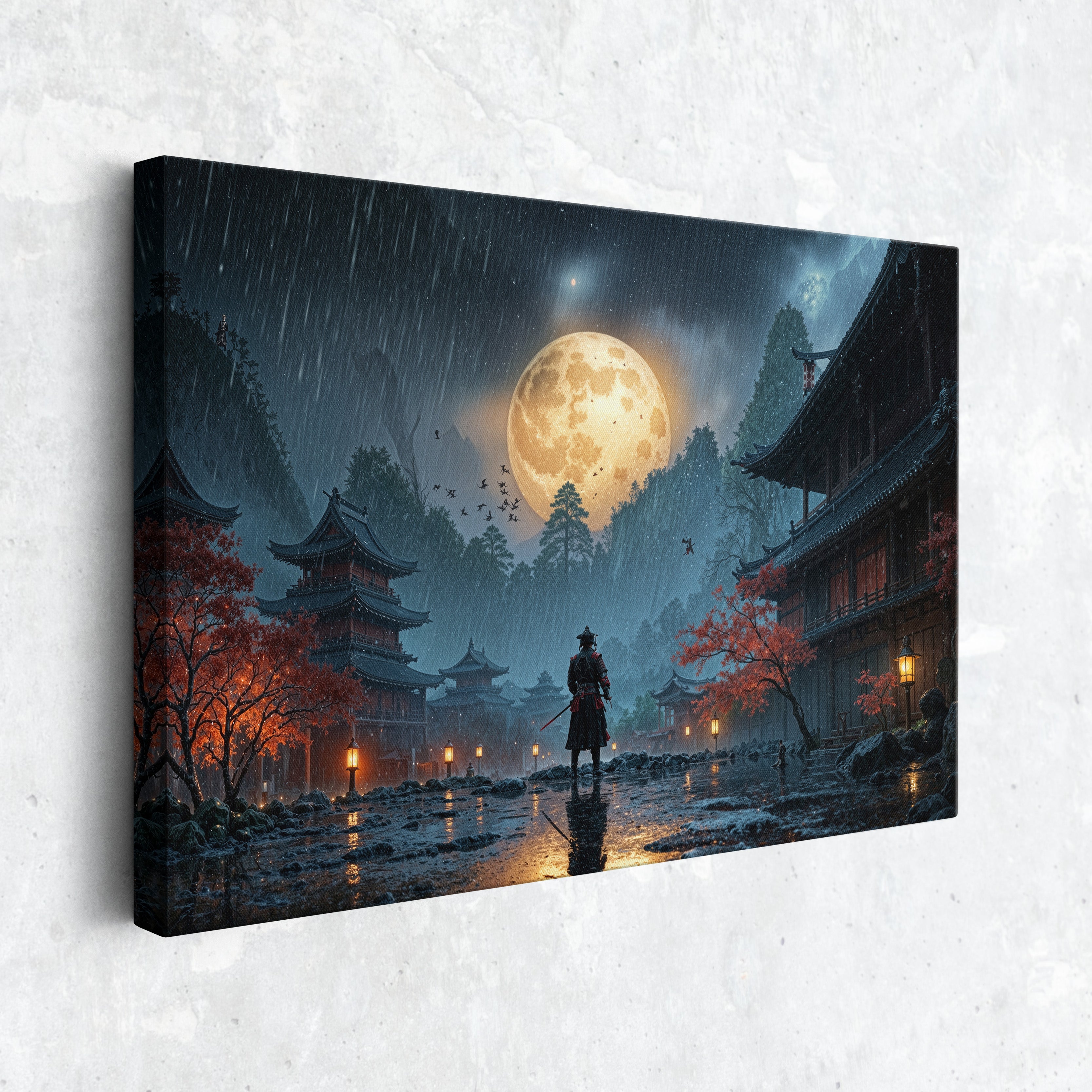 "Moonfall in the Warrior's Silence" captures a hauntingly cinematic moment beneath a luminous full moon. A lone samurai stands resolute in a rain-slicked courtyard, surrounded by crimson maple trees and the quiet strength of traditional Japanese architecture. This dramatic artwork is perfect for creating a meditative atmosphere, invoking the themes of honor, solitude, and timeless beauty. A powerful addition to any Japanese-inspired home decor or space that values story-rich, evocative design.