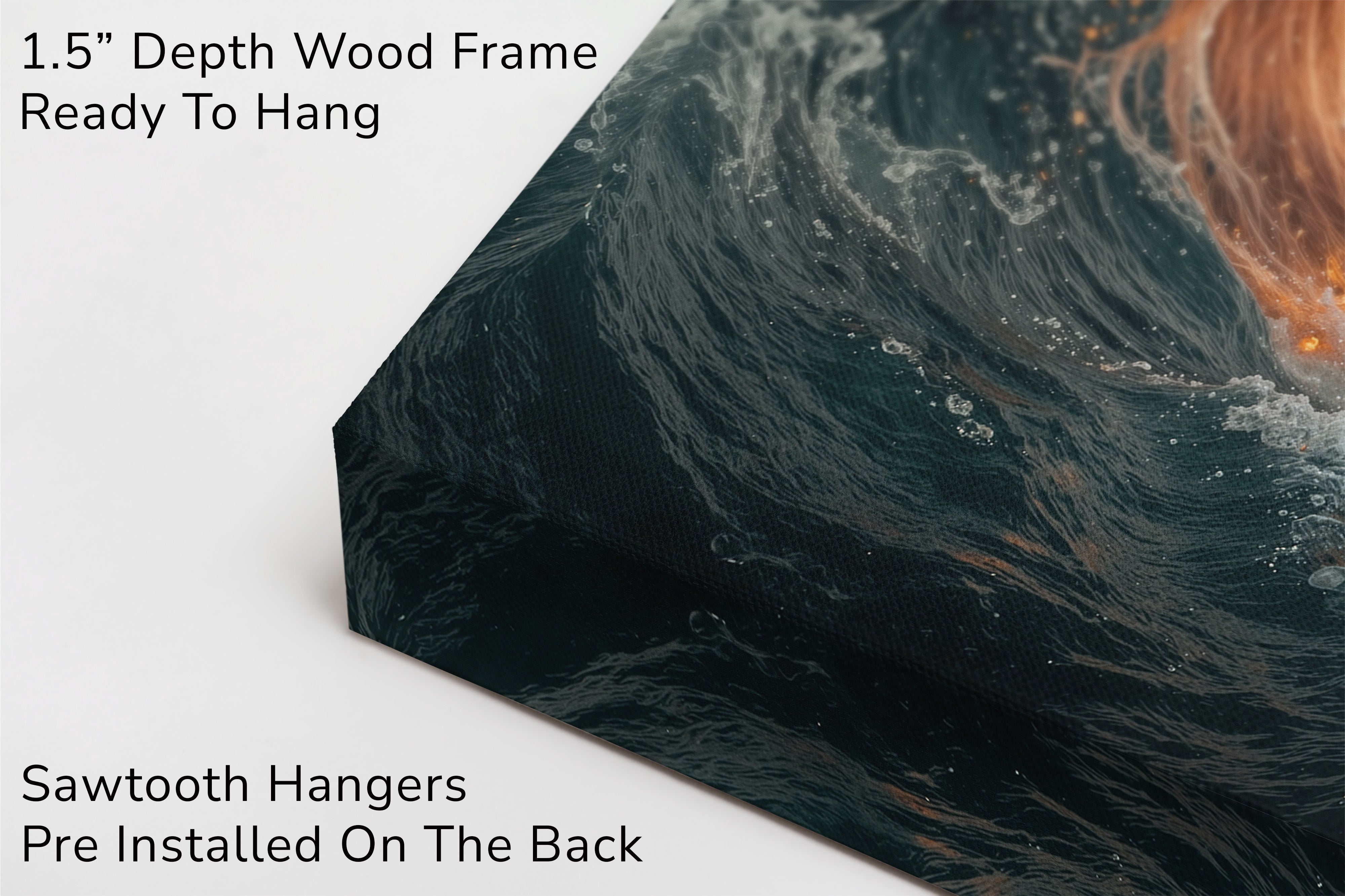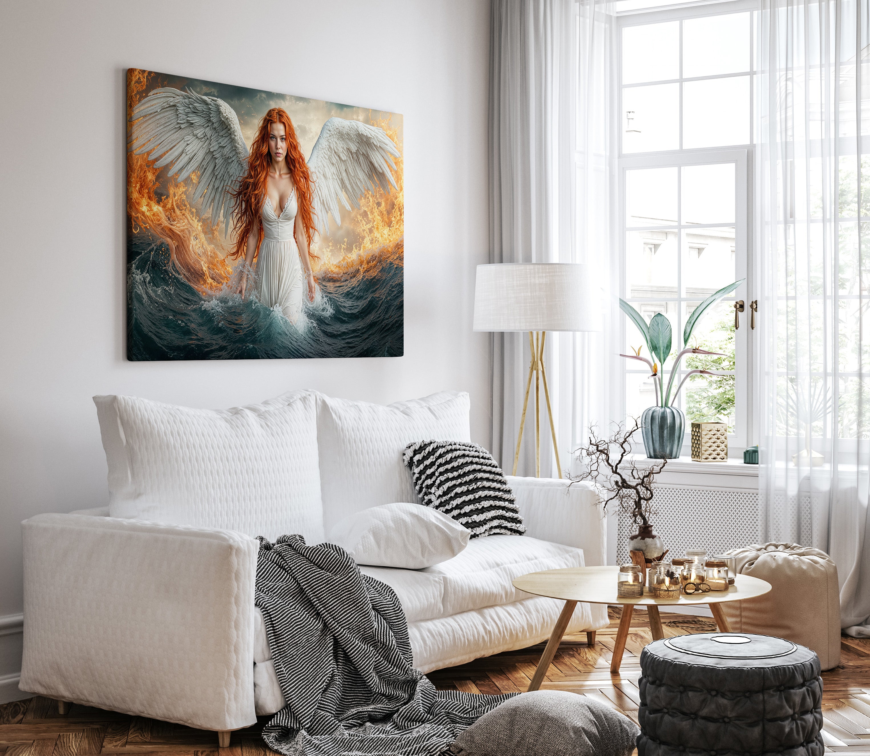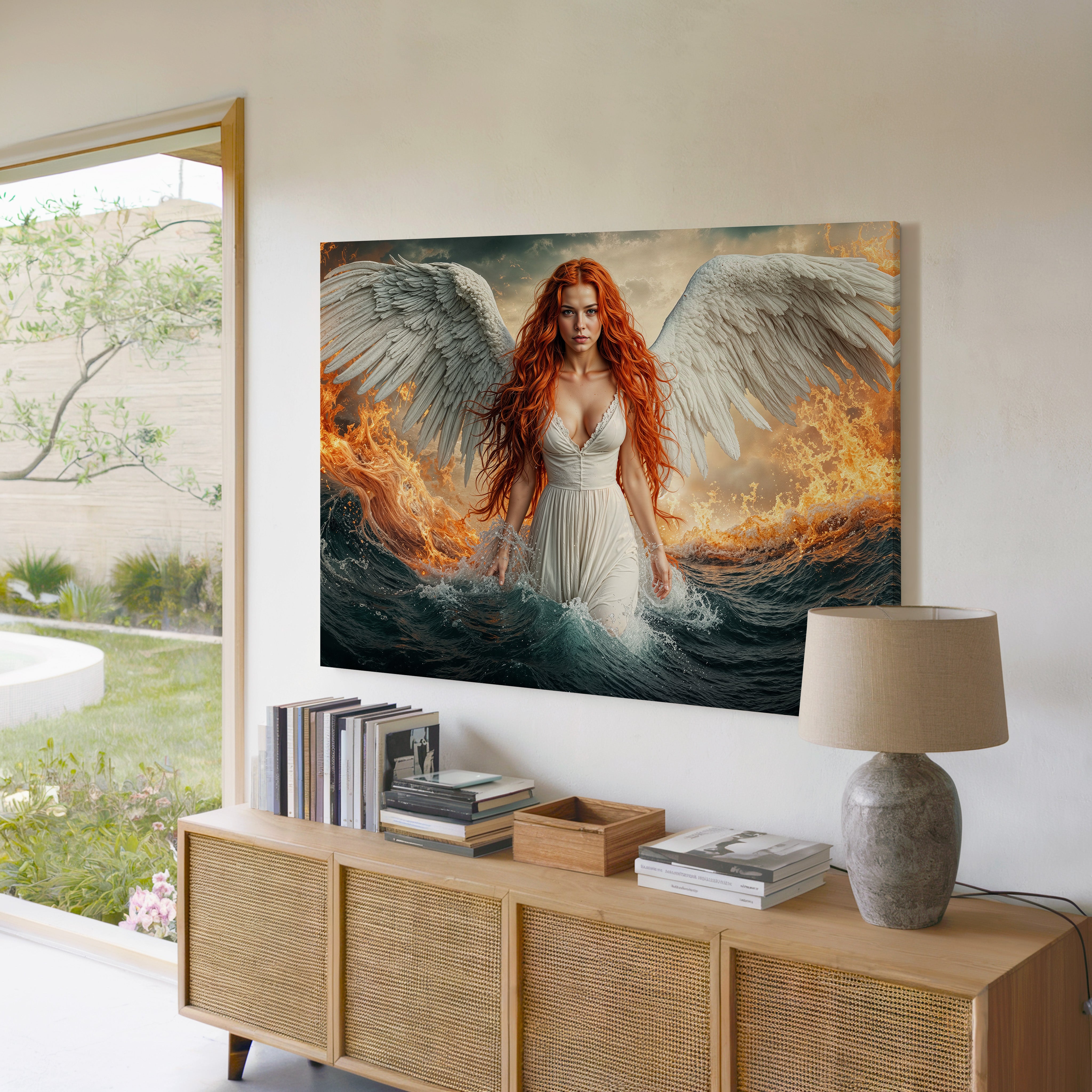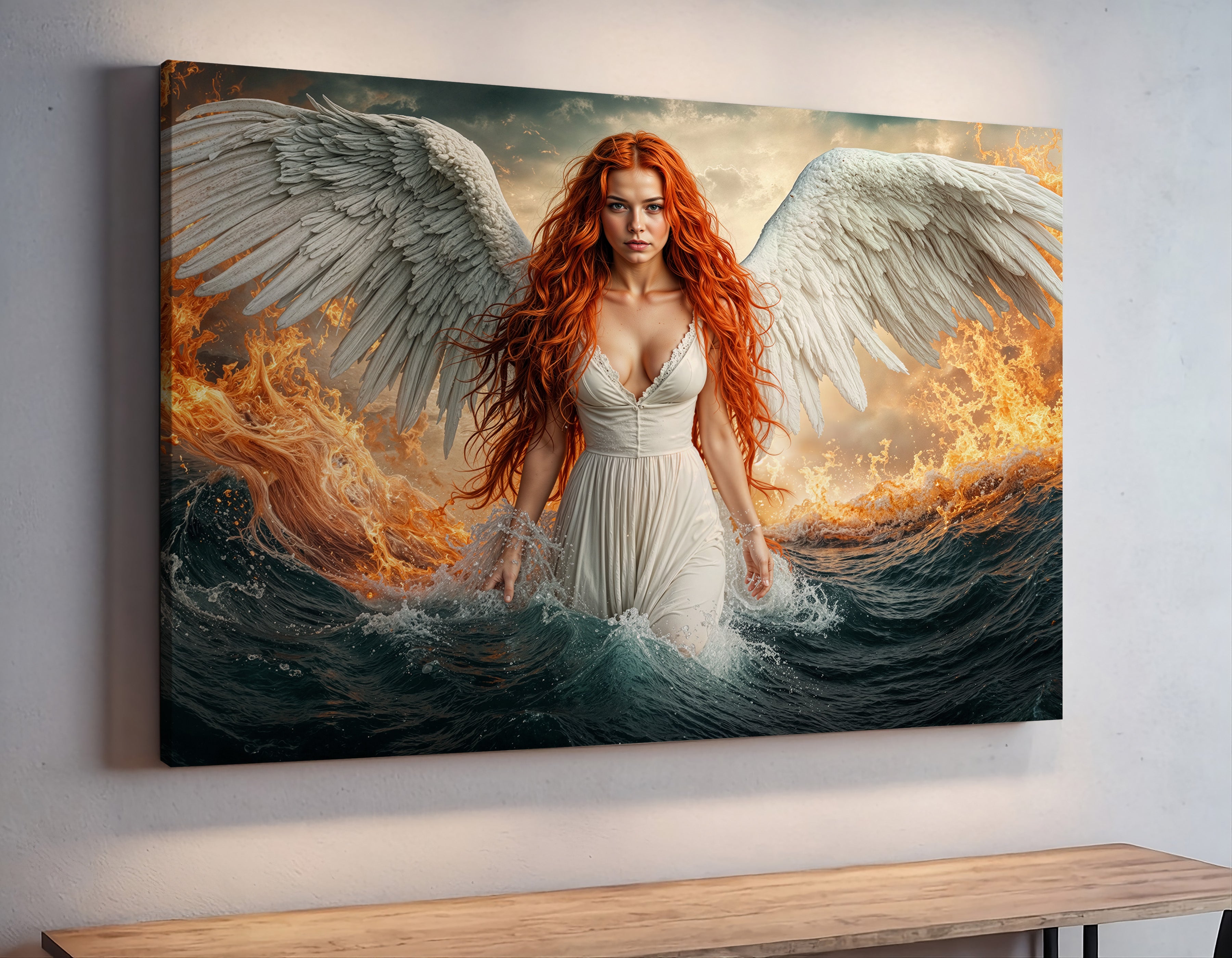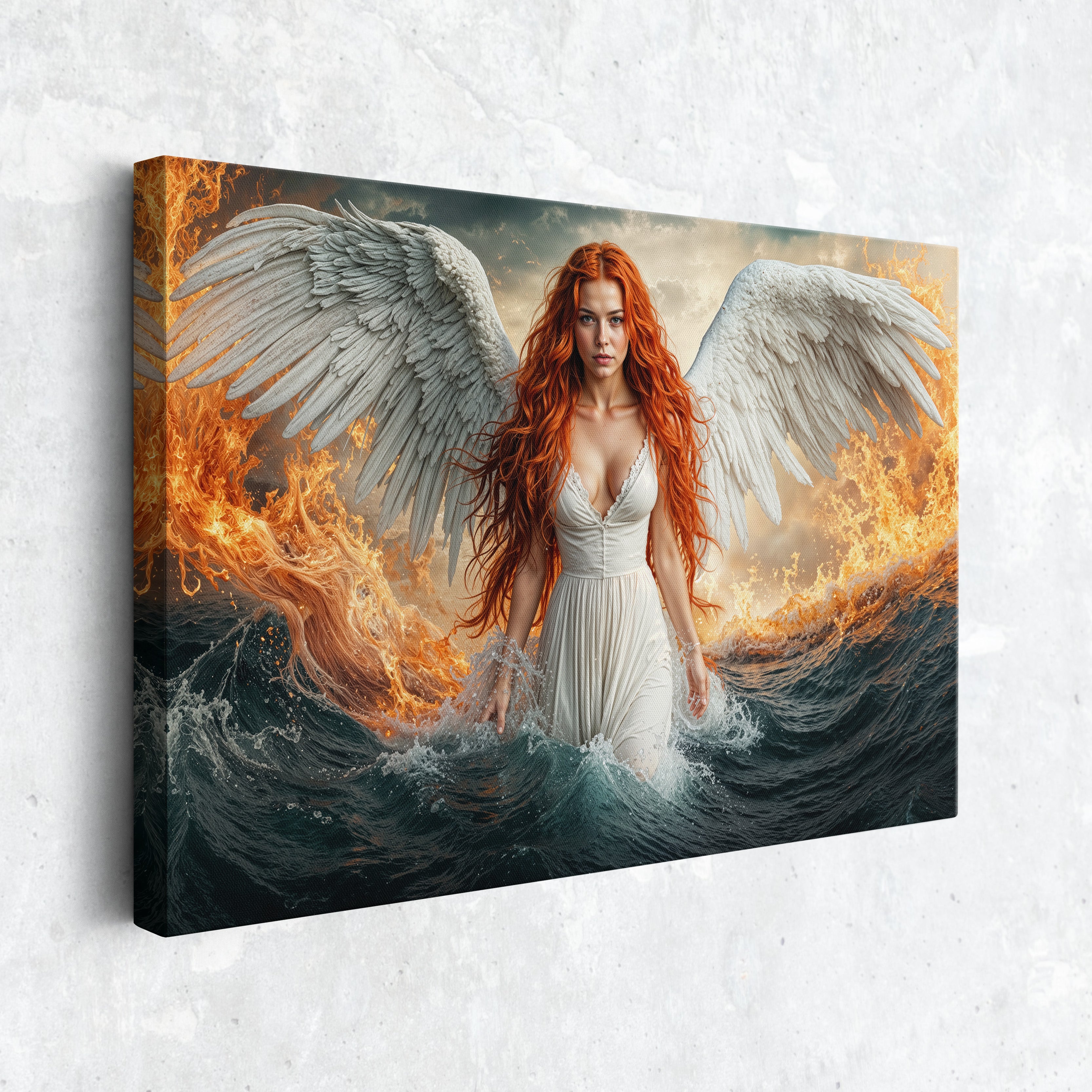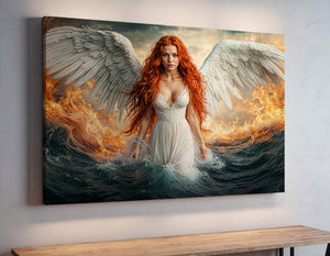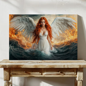 A celestial figure emerges between fire and ocean — her wings pure and radiant, her gaze unwavering, her flame-colored hair igniting the waves around her. This breathtaking fantasy canvas print captures the power and serenity of a heavenly guardian walking the boundary between chaos and calm. "Emberfall from Heaven’s Shore" is a dramatic fantasy artwork ideal for lovers of mythic themes, powerful feminine imagery, and bold visual storytelling. Printed on gallery wrapped canvas, it makes an unforgettable centerpiece in any space seeking impact and imagination.