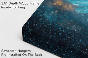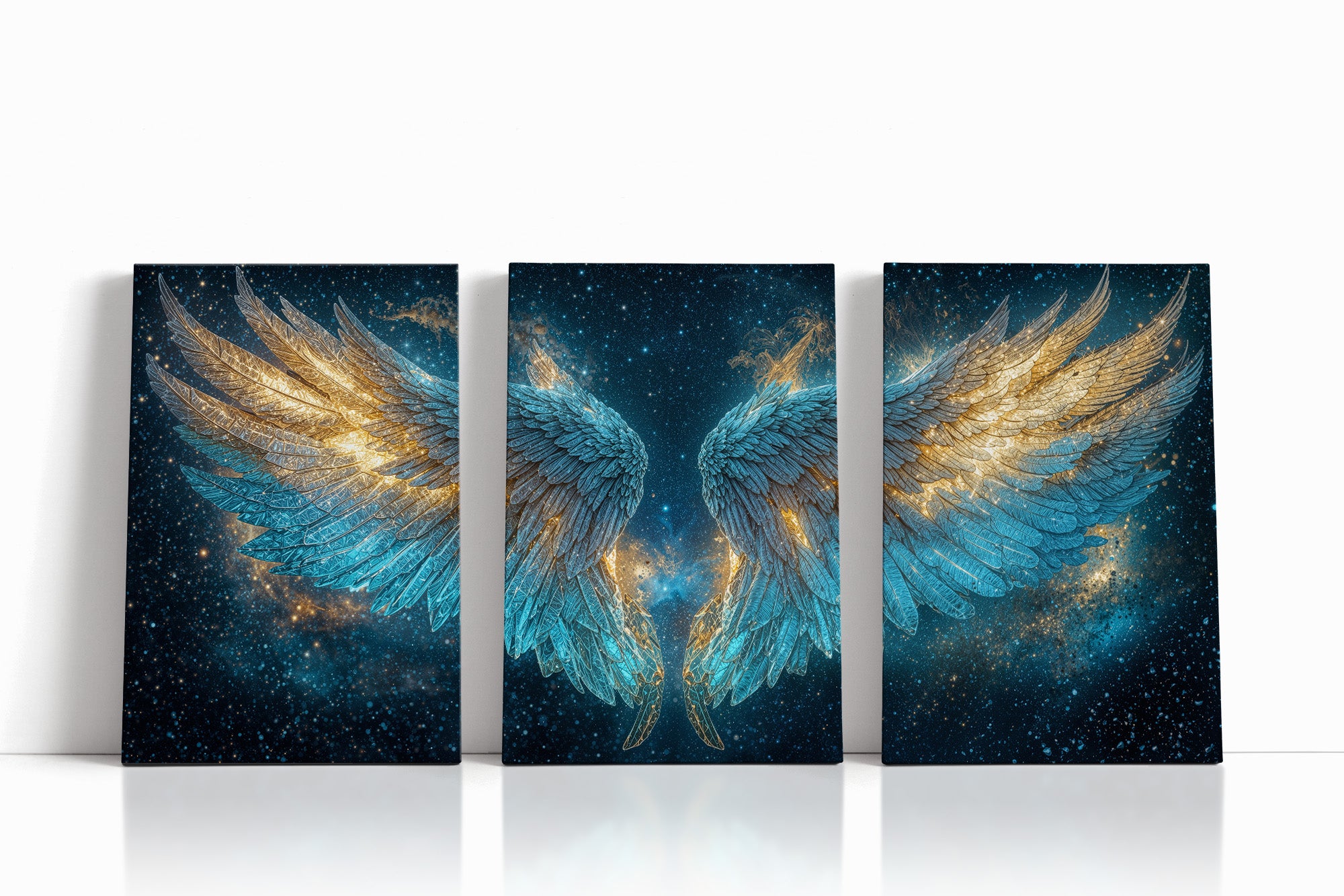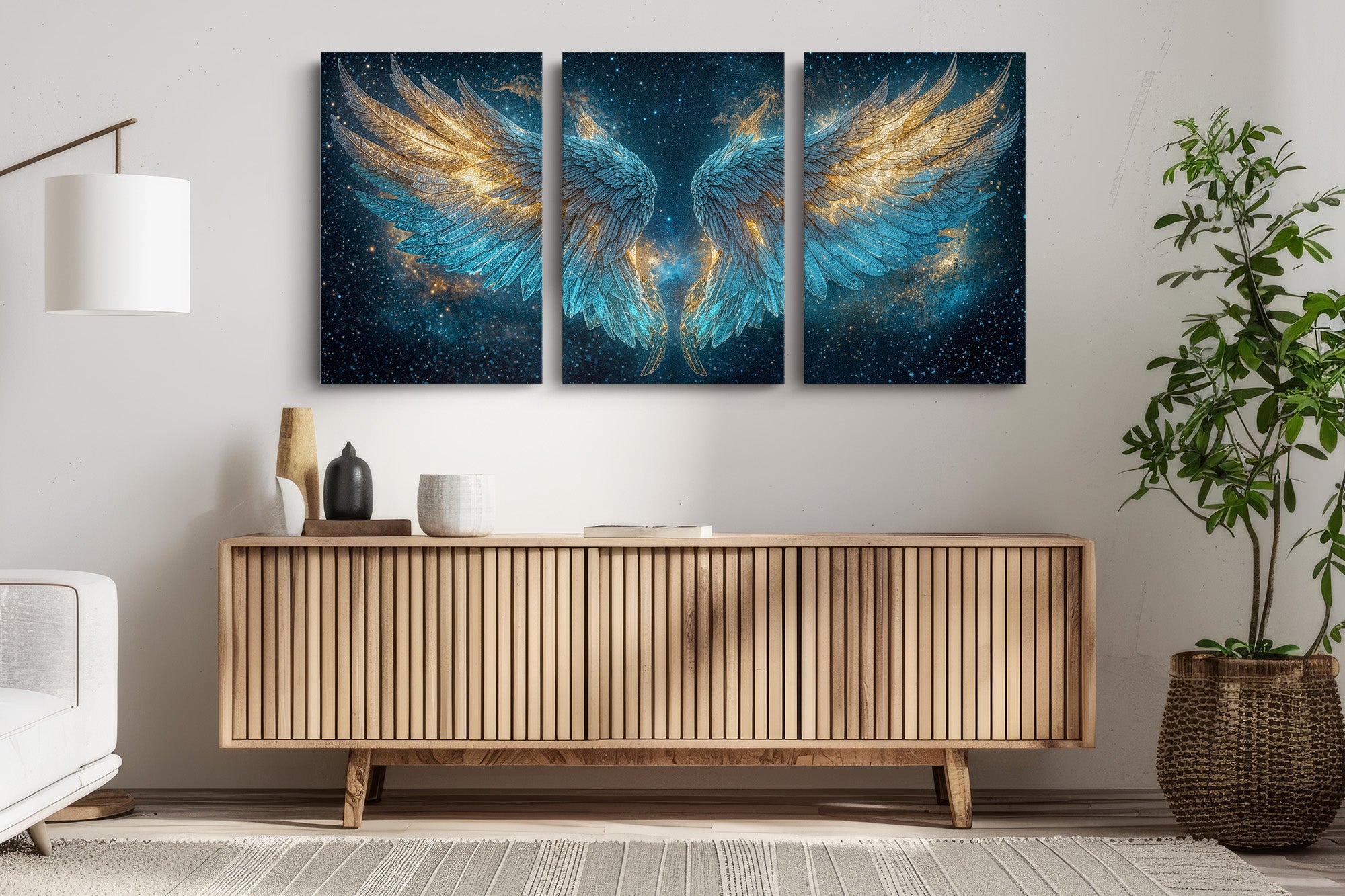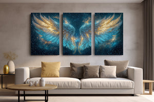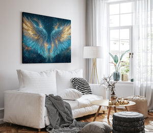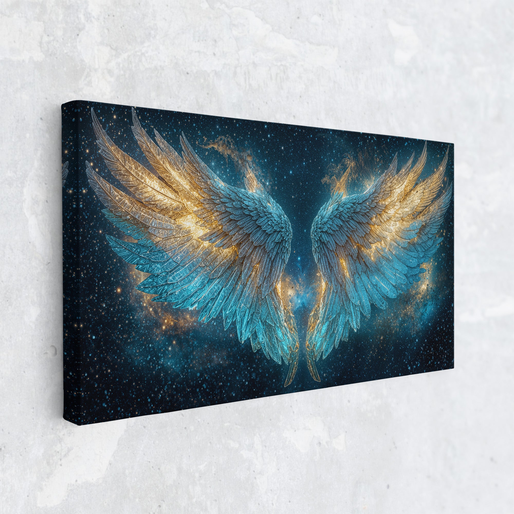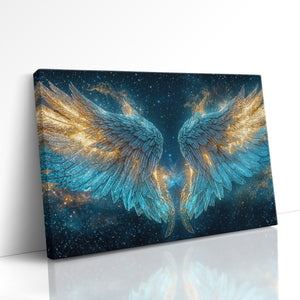 A radiant pair of ethereal angel wings stretches wide against a celestial sky, their feathers woven with glowing filaments of gold and blue light. Set against a swirling galaxy of stars, this otherworldly composition evokes both serenity and cosmic power. This celestial canvas print is a stunning fusion of fantasy and space, perfect for adding a luminous, spiritual touch to any room.