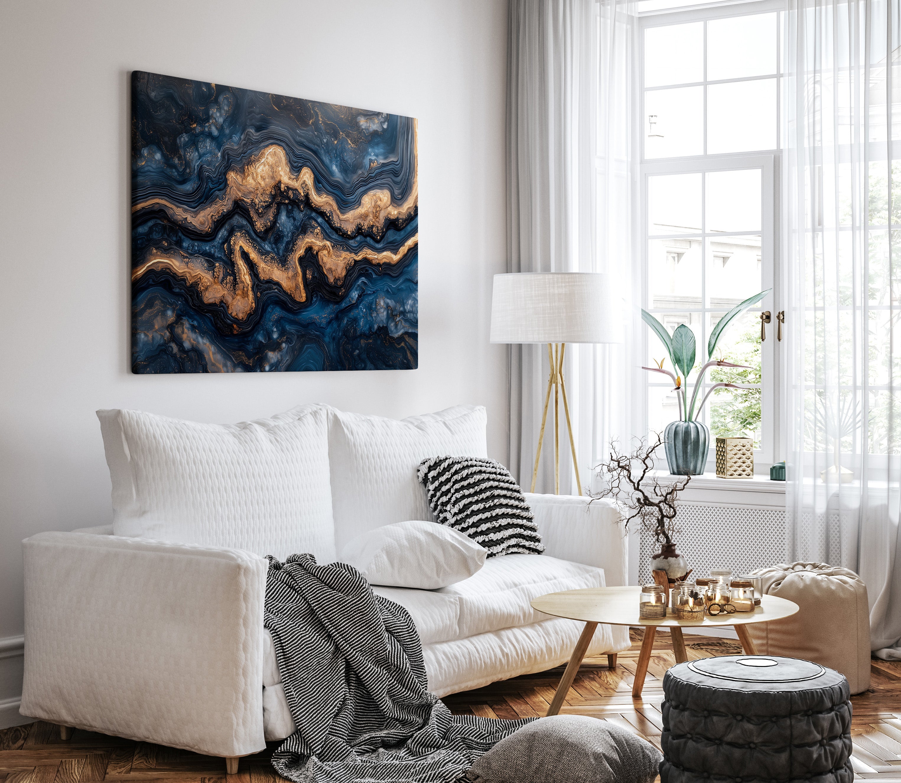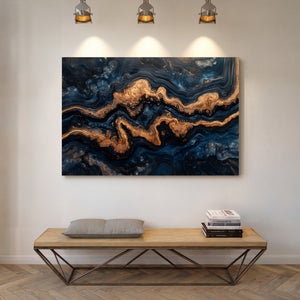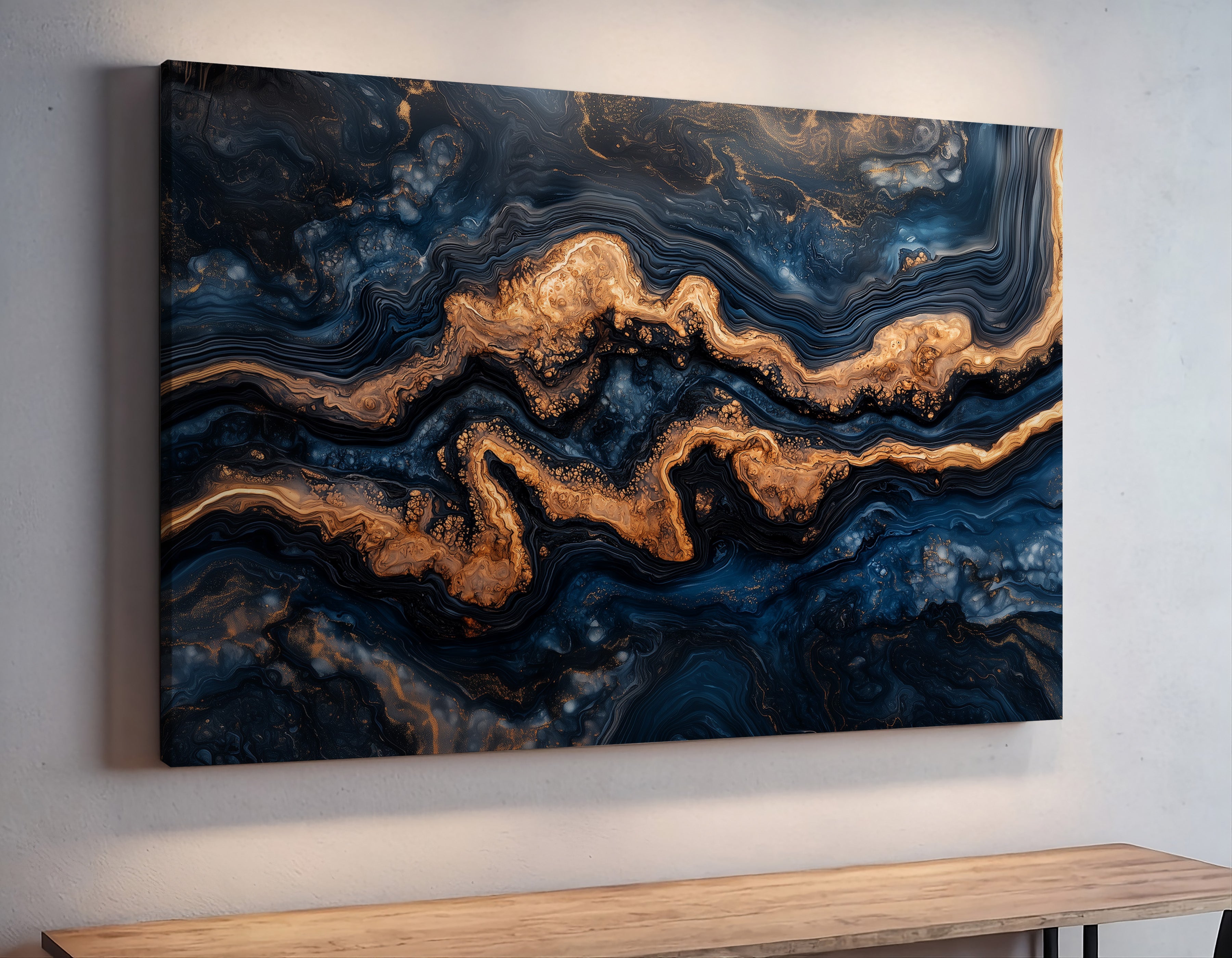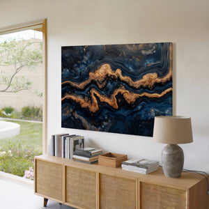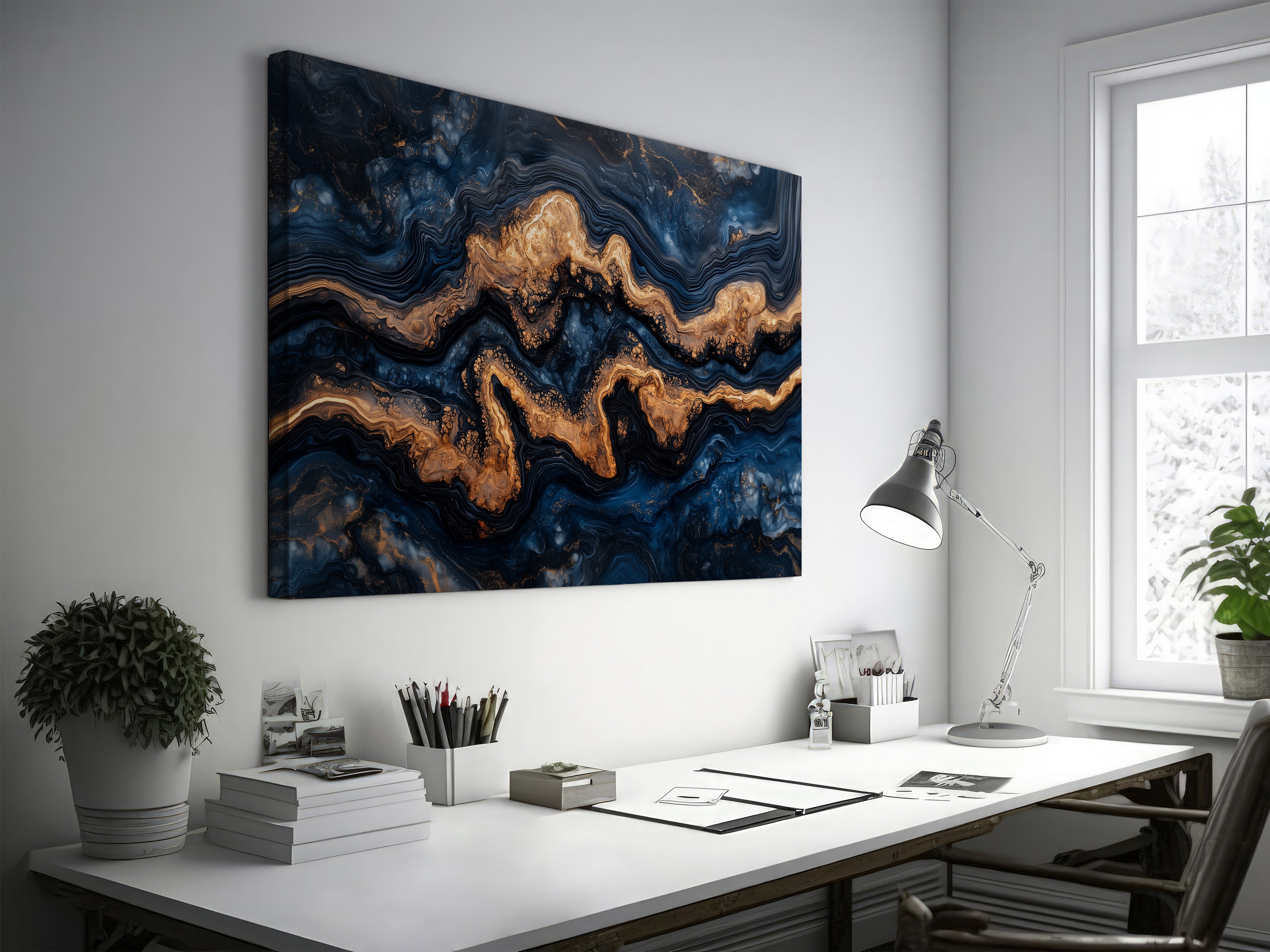 A striking interplay of molten gold and inky black, “Molten Midnight” commands attention with its bold contrast and flowing texture. This abstract composition evokes the shimmer of volcanic metals against a midnight sky, fusing natural energy with modern elegance. Printed on a premium 1.5" gallery-wrapped canvas, this piece brings depth, drama, and refinement to any interior. Whether featured in a contemporary living space or a moody office retreat, “Molten Midnight” is a luxurious statement of artful power.