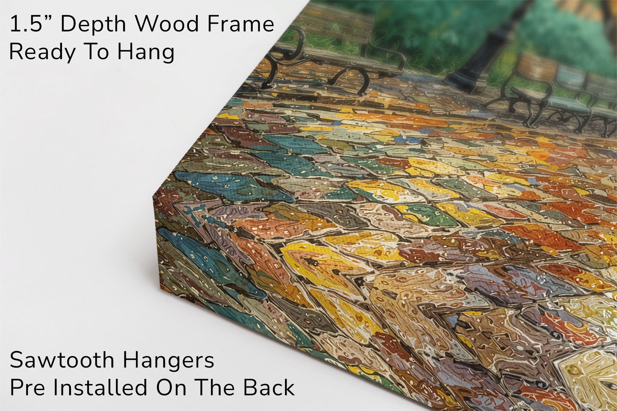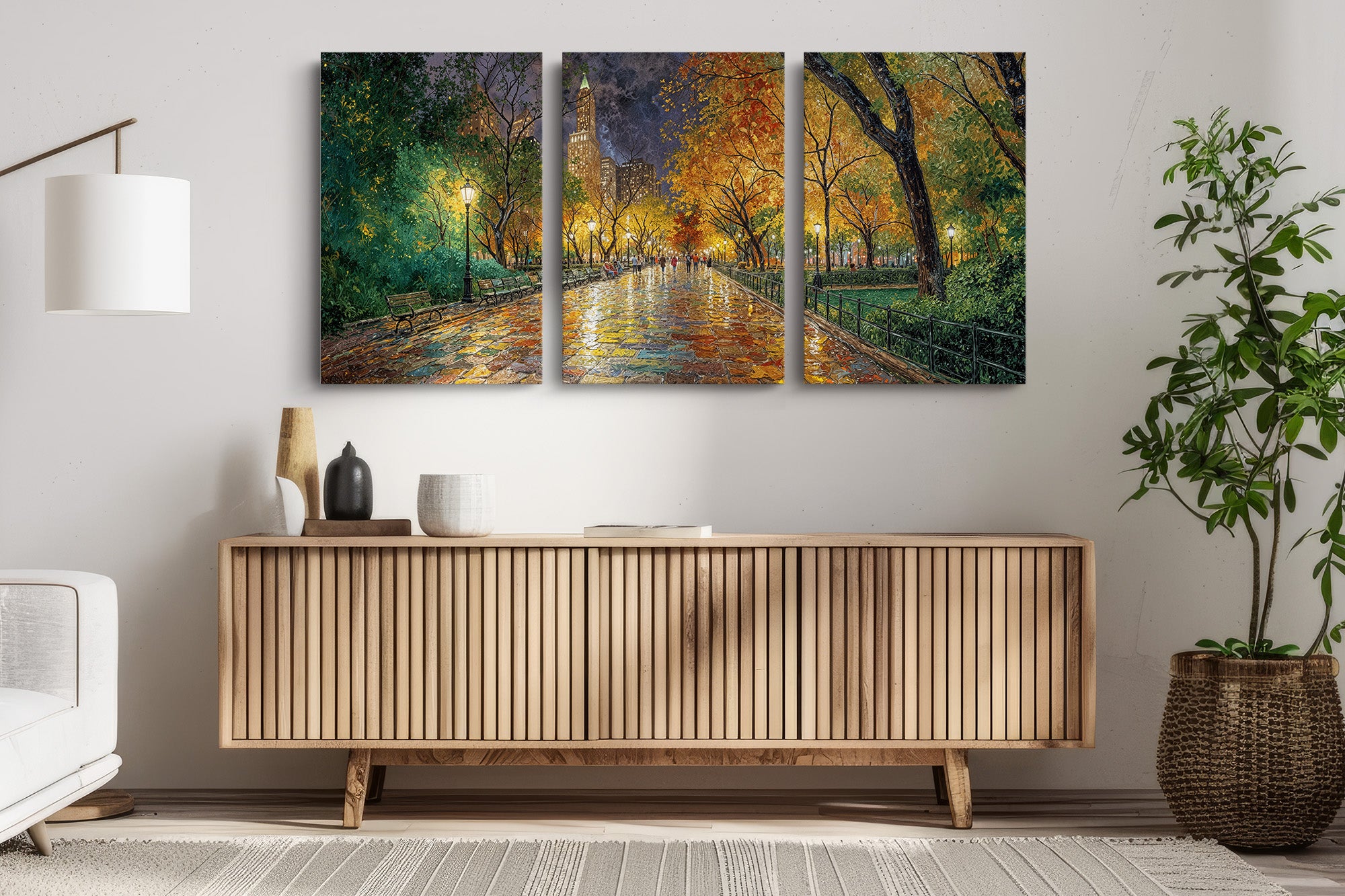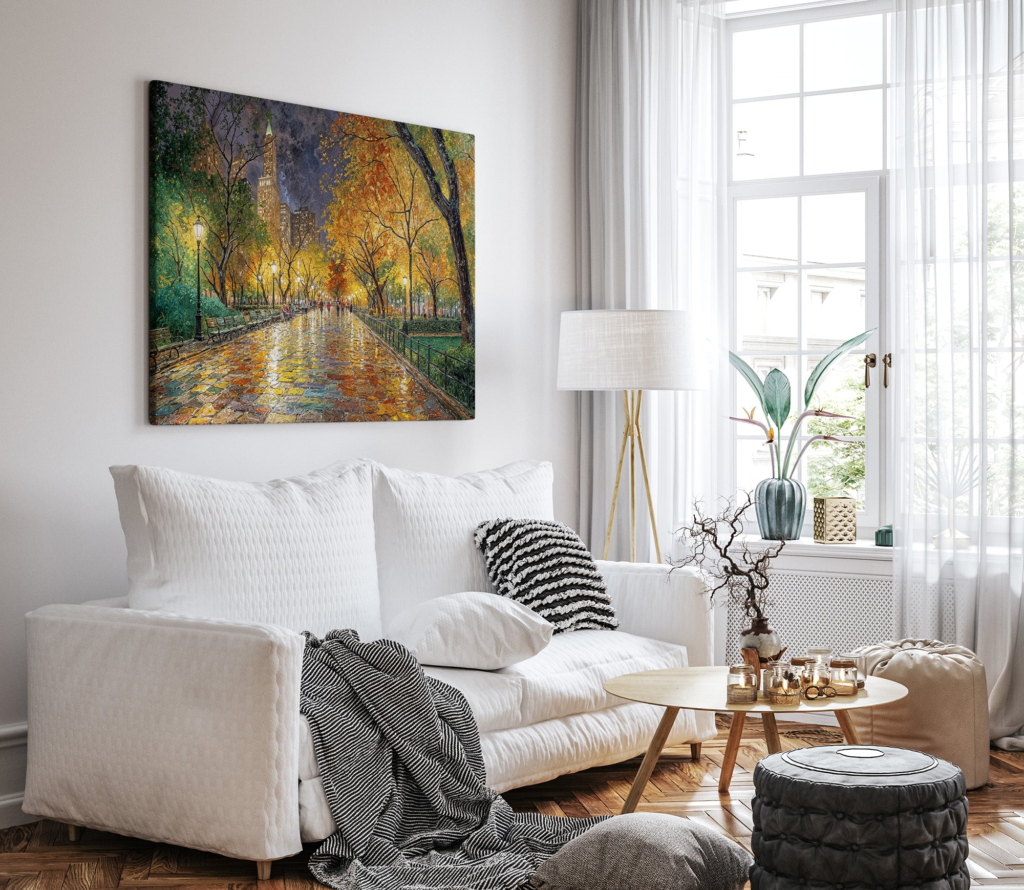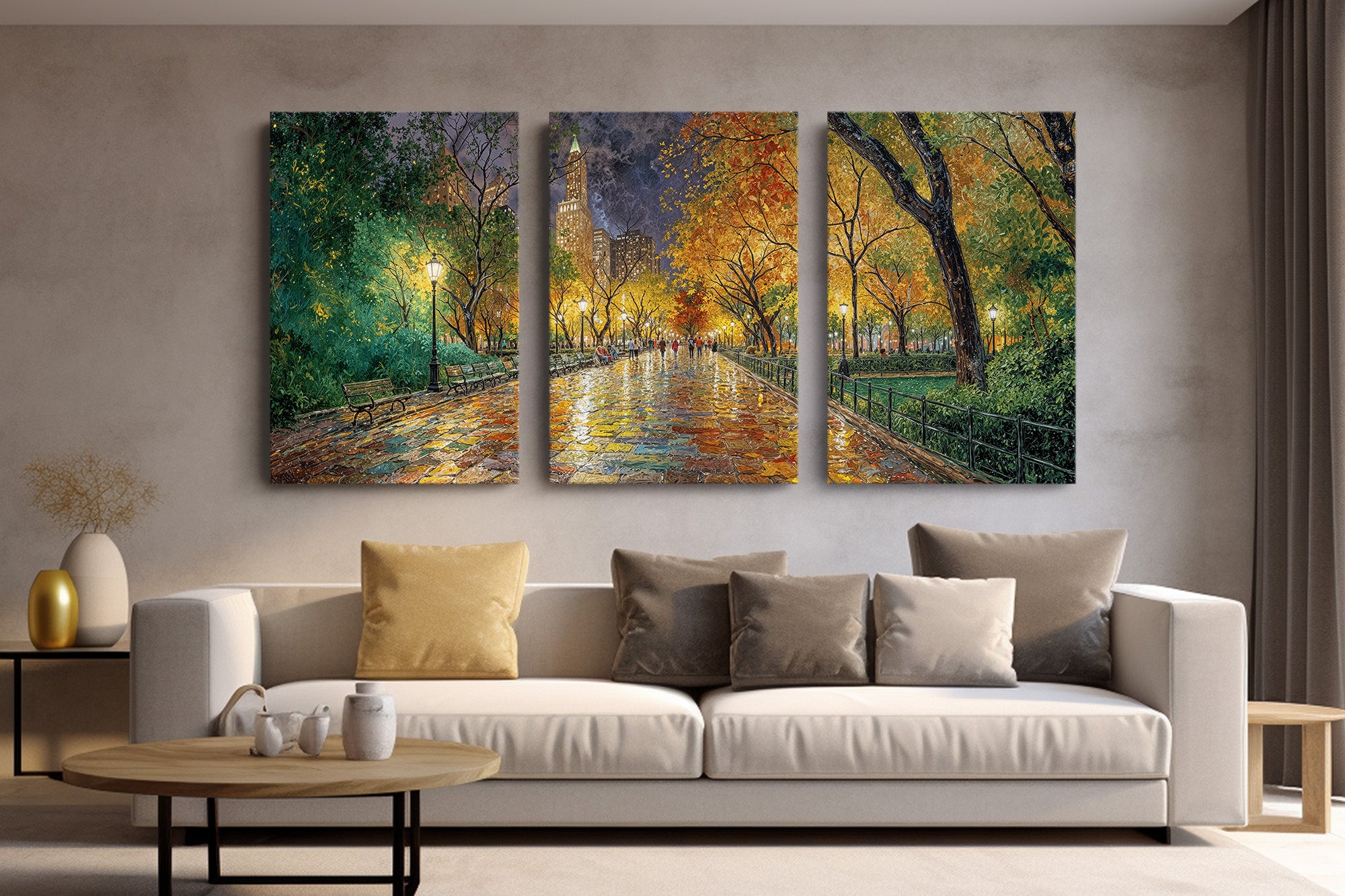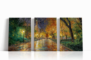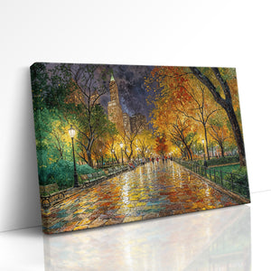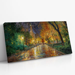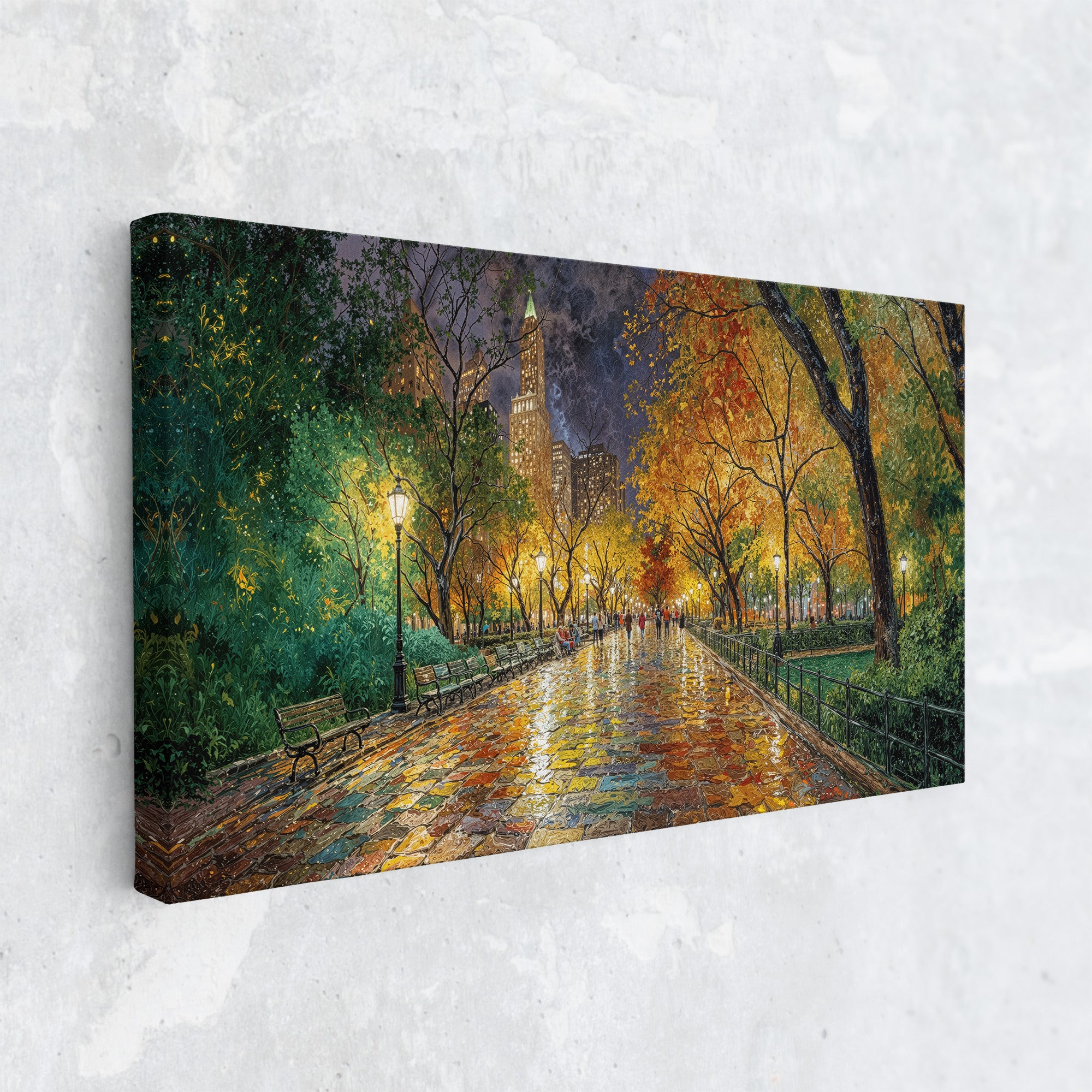 Immerse yourself in the romance of an autumn stroll through a vibrant city park. "Reflections of Fall in the City Heart" captures golden leaves, glowing lamplight, and rain-kissed cobblestones in a painterly scene full of warmth, nostalgia, and color. This captivating canvas print brings seasonal charm and painterly elegance to any interior — perfect for cozy living rooms, reading nooks, or refined urban decor.