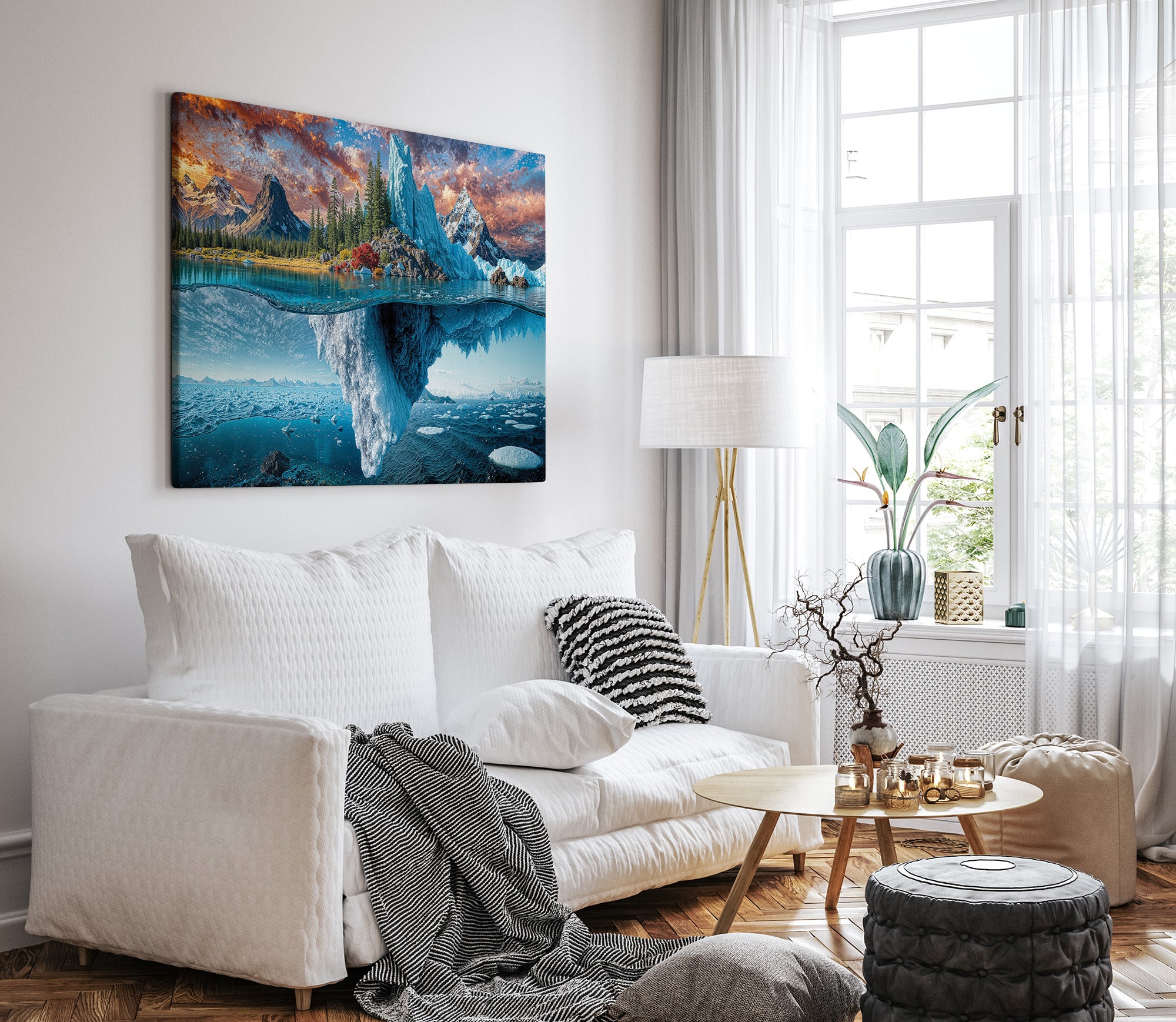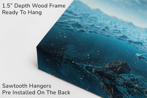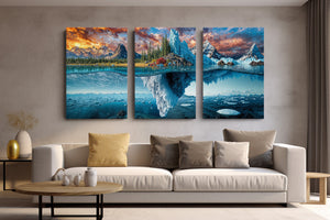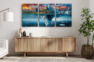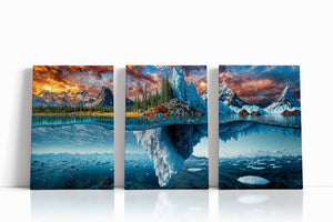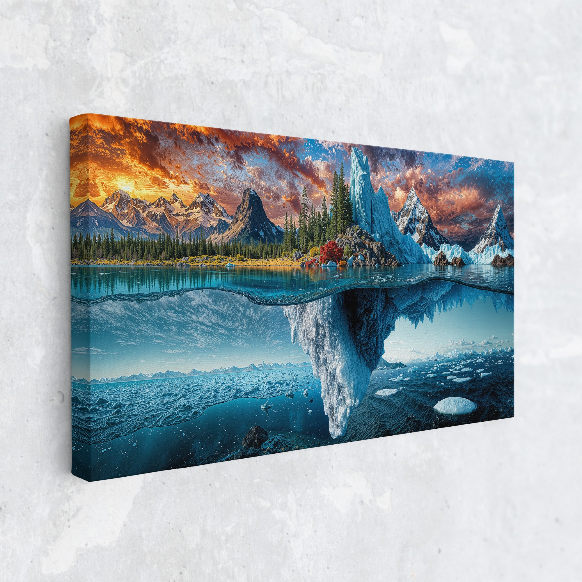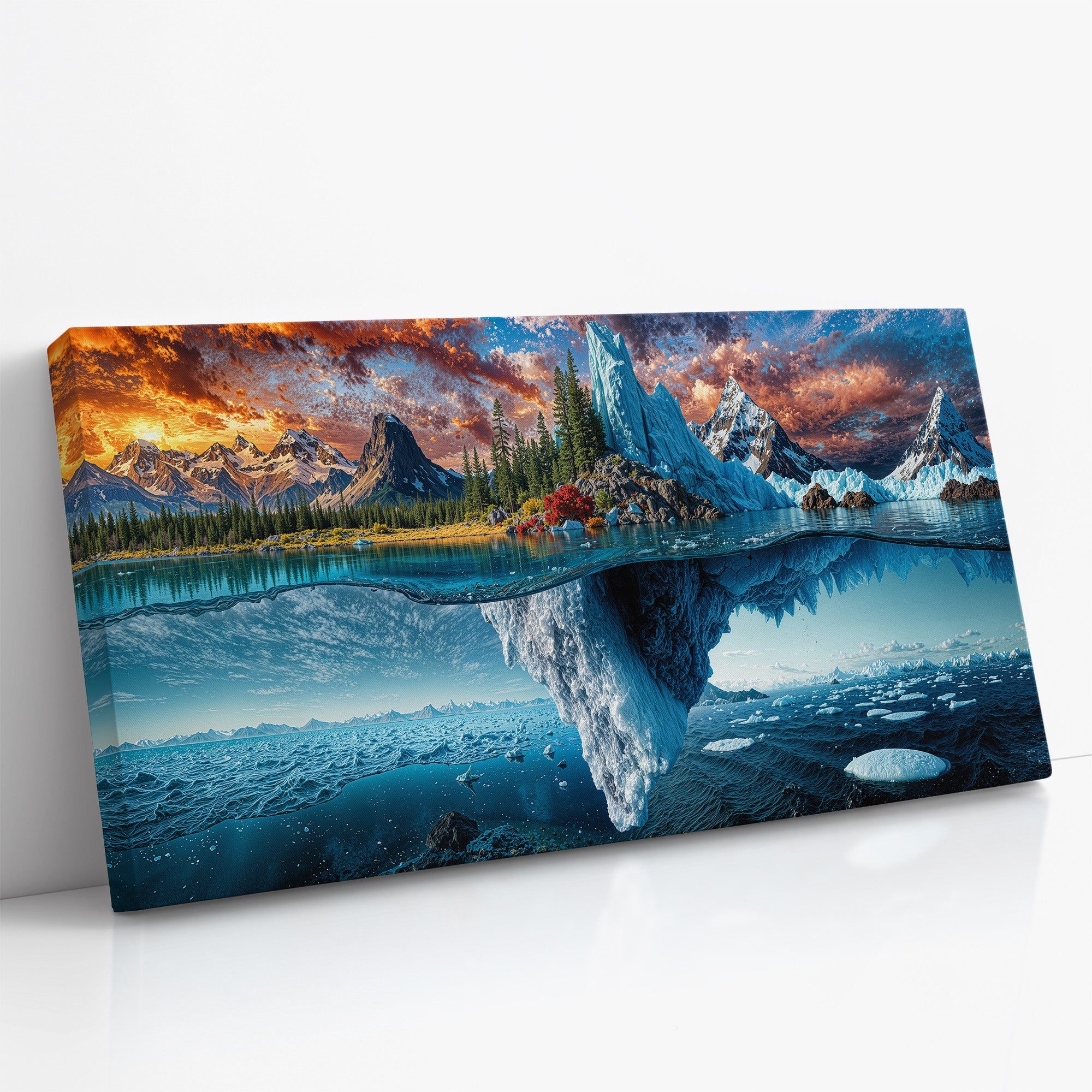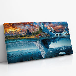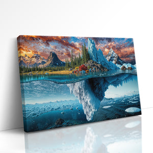 A breathtaking landscape where autumn forests and icy glaciers collide — above the surface, golden trees and craggy peaks reflect the warmth of fall; below the waterline, an immense frozen world stretches into the depths. This split-view masterpiece captures nature’s dramatic transition between seasons, from fire-touched skies to frozen undercurrents. A bold visual statement for adventurous interiors, cabin decor, or lovers of surreal landscapes.