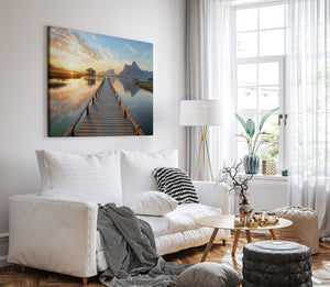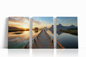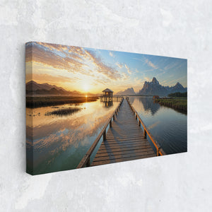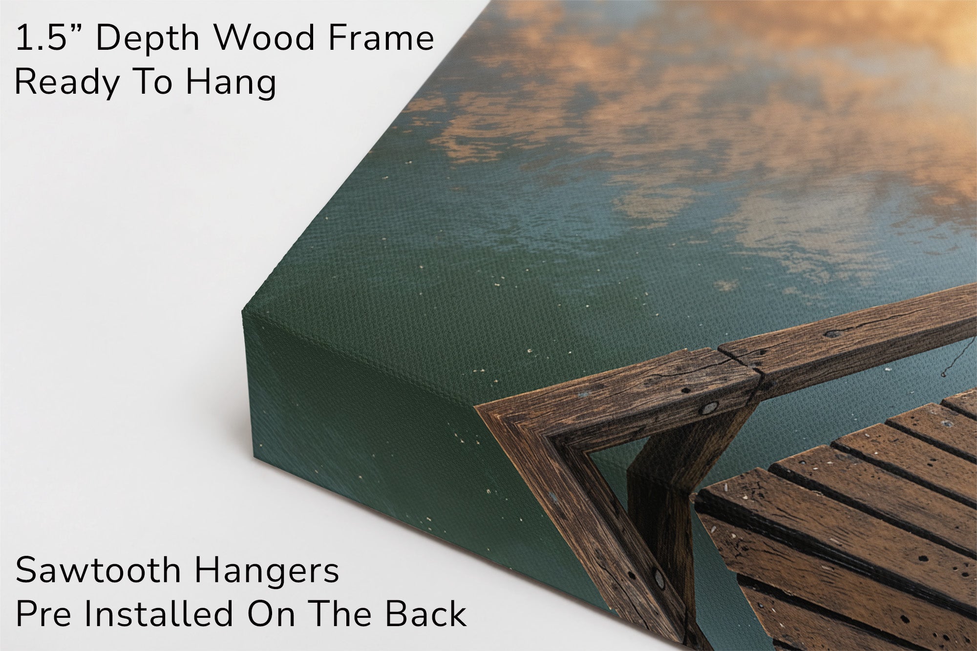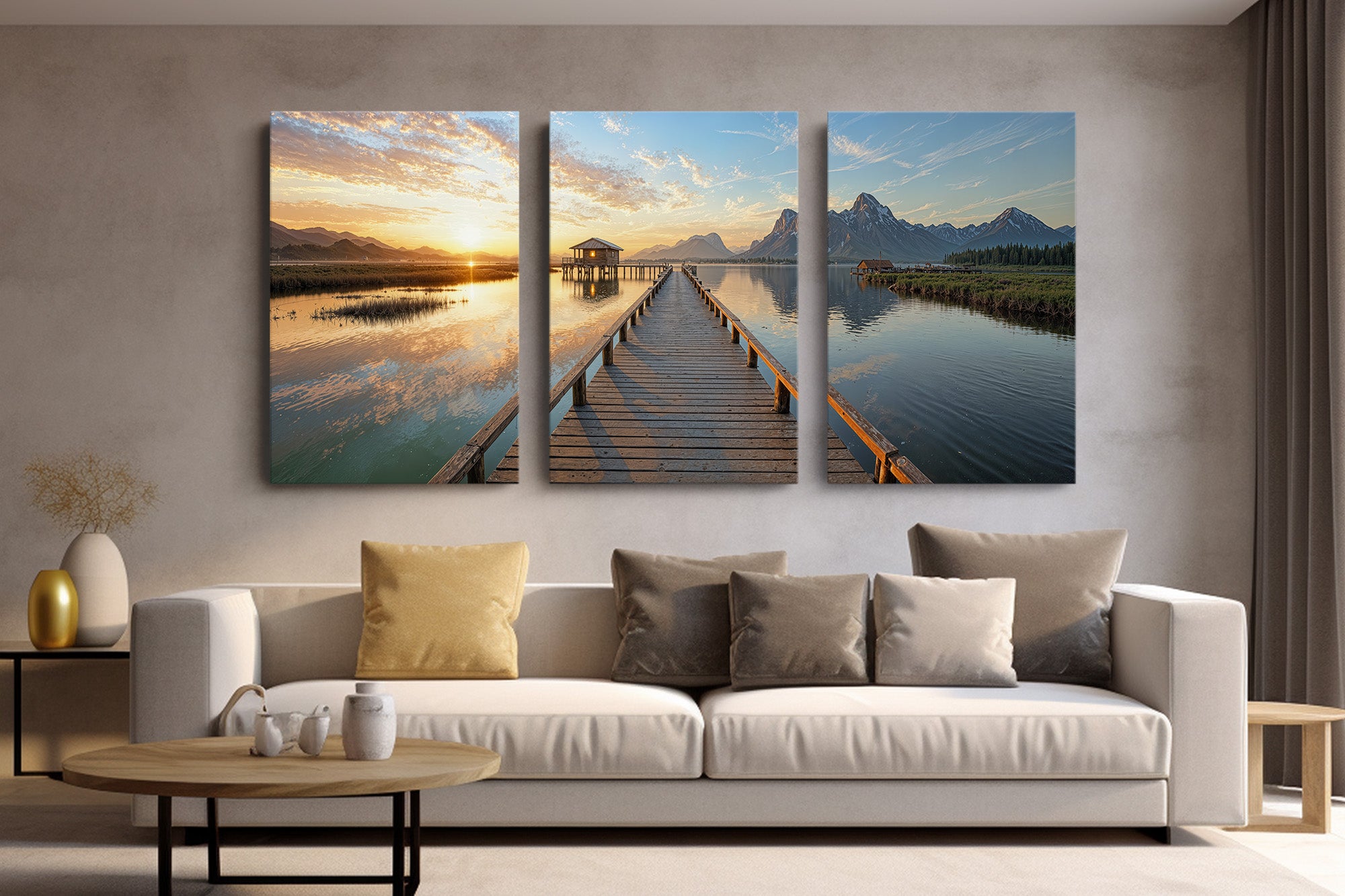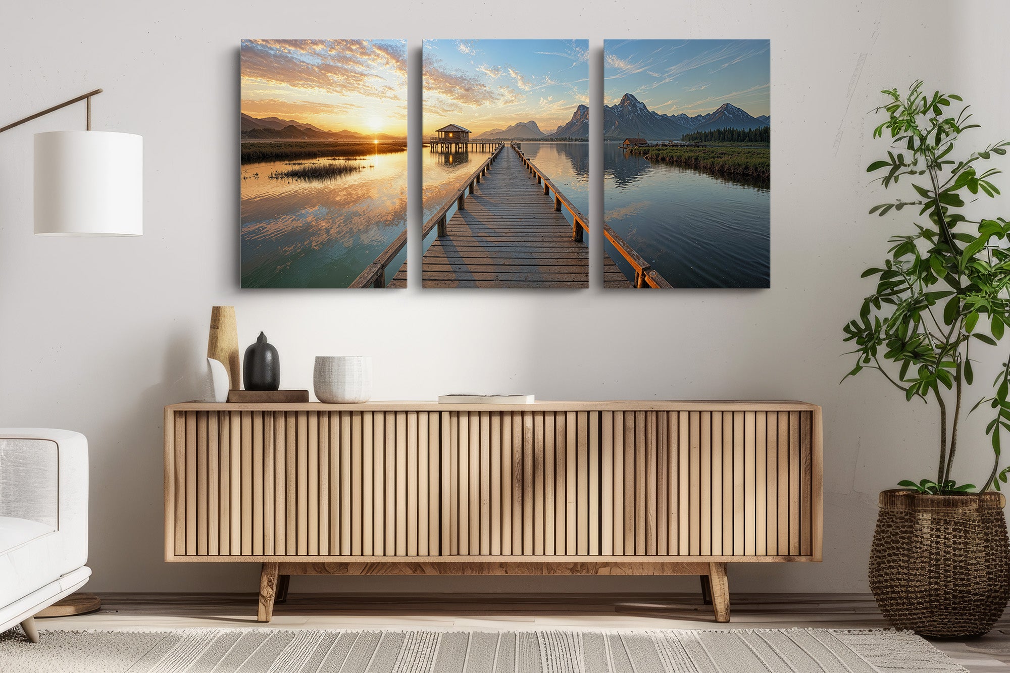 Begin each day with a sense of calm and wonder with this scenic sunrise canvas print. Featuring a wooden dock leading into tranquil lake waters, this piece captures the soft glow of morning light reflecting off the surface, surrounded by snowcapped mountains and warm-toned skies. A cabin nestled on the water adds rustic charm to this peaceful mountain view. This nature landscape canvas print is perfect for creating a serene focal point in bedrooms, living rooms, or lake houses. A meaningful gift for those who love lake life, mountain adventures, or sunrise moments.