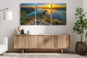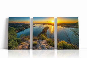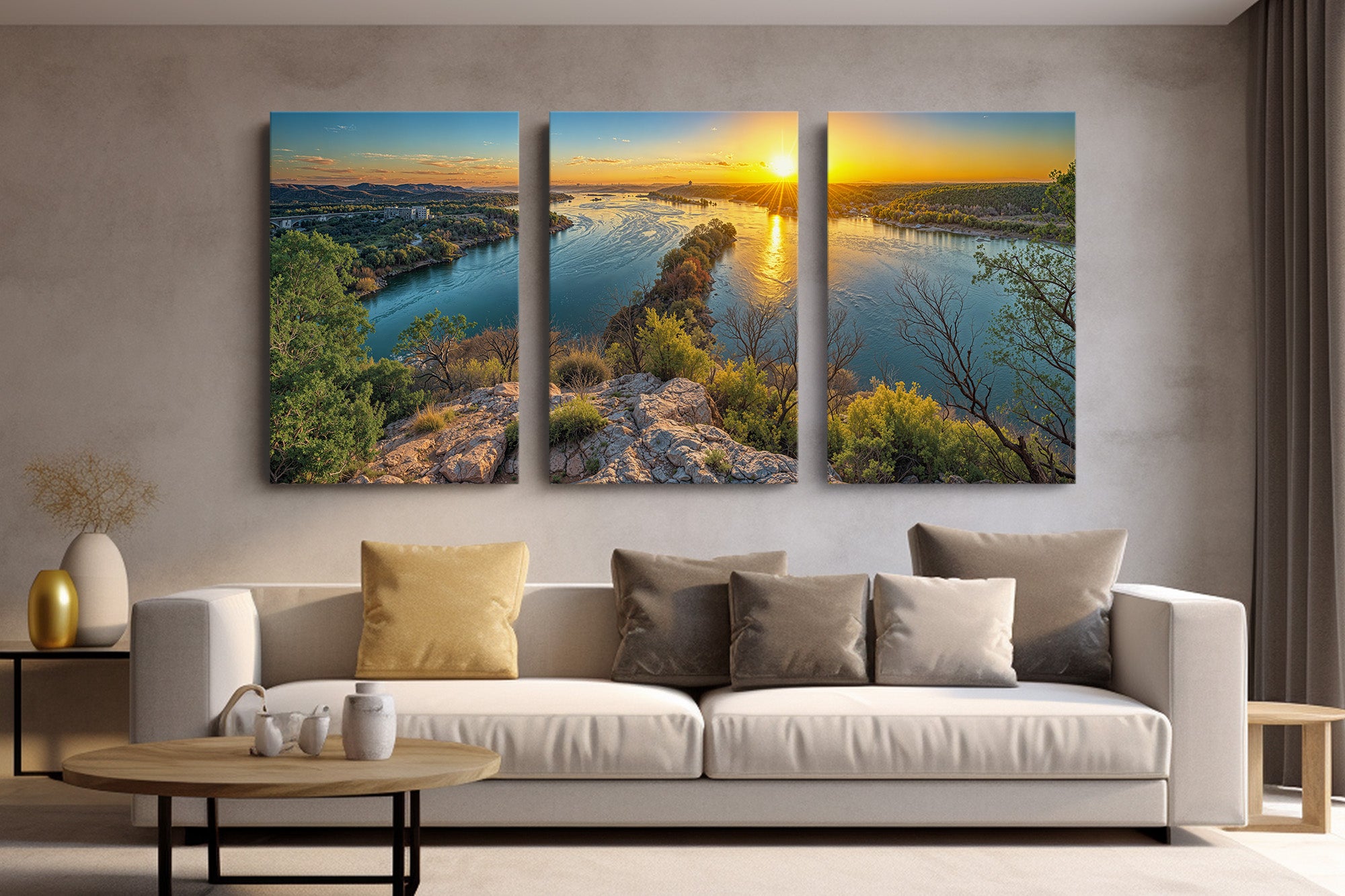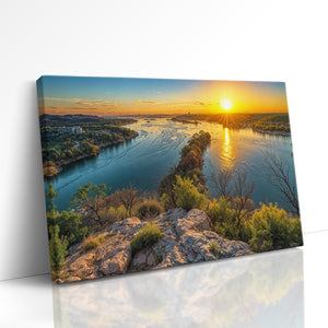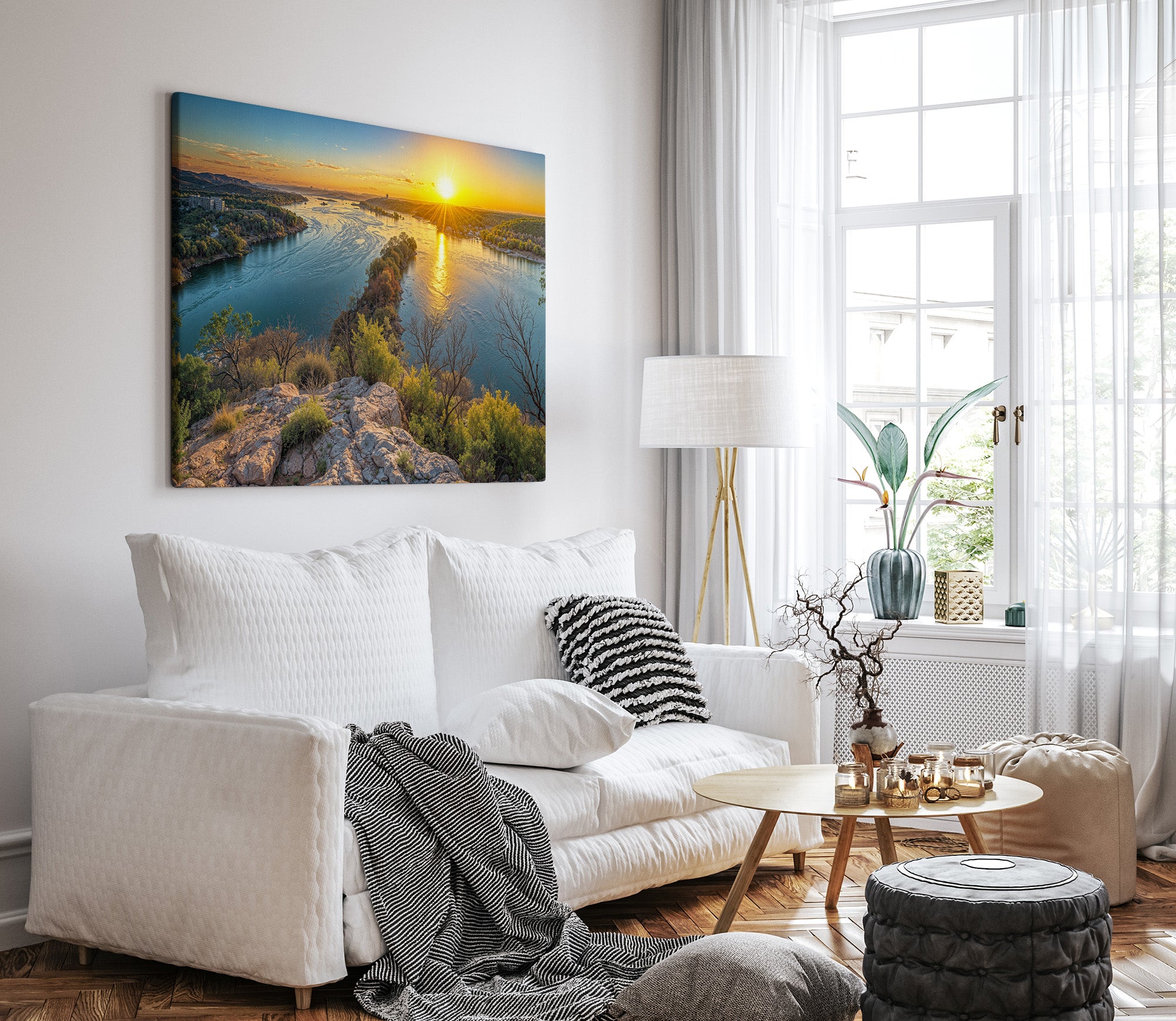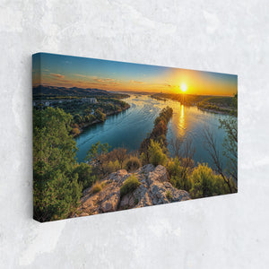 A golden sun sets over a winding river, casting long reflections across gentle waters as trees and rugged stone shimmer in the fading light. This peaceful scene captures the quiet magic of twilight, blending nature's calm with the warmth of day’s end. Ideal for bringing serenity and light to living rooms, bedrooms, or workspaces.