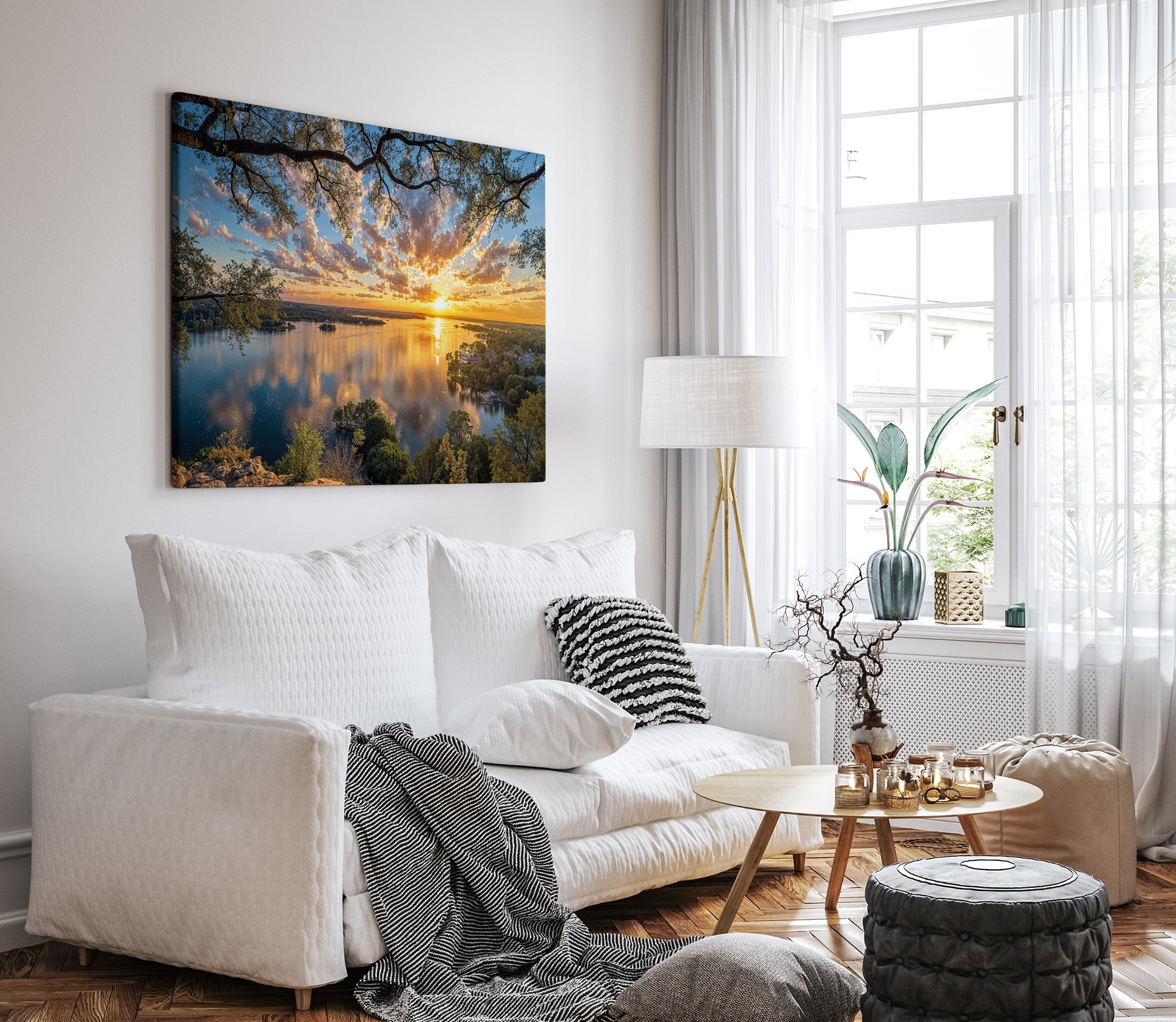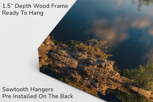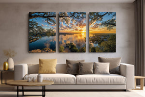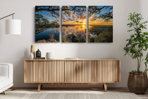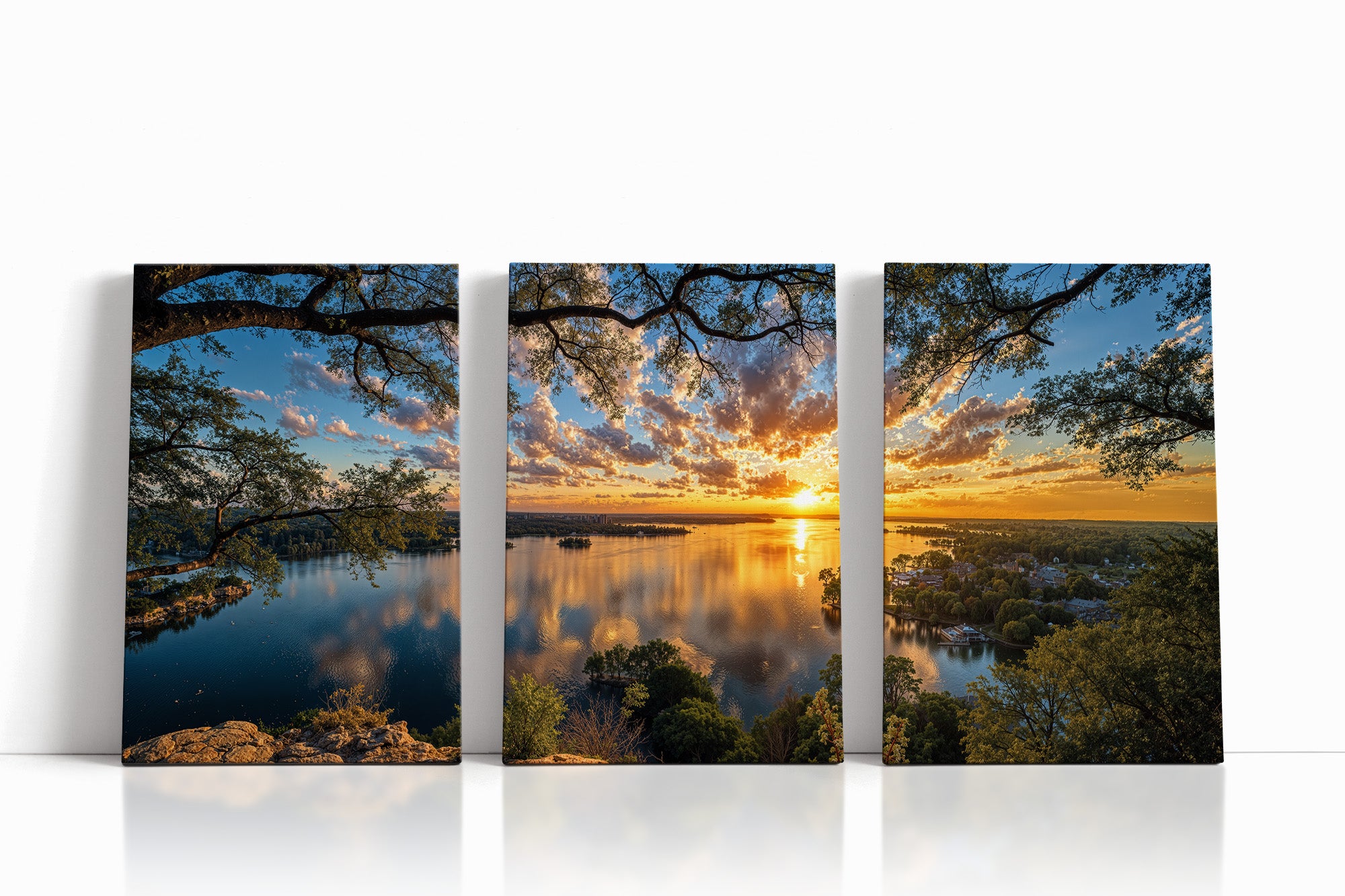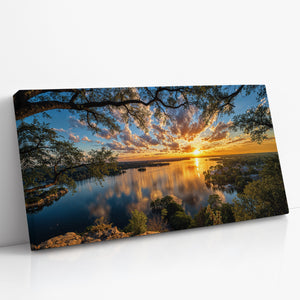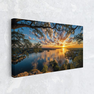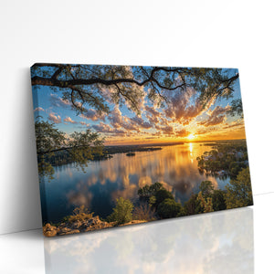 A golden sunset stretches across a shimmering lake as wispy clouds drift through a painted sky. Trees frame the moment from the cliffside, while the tranquil town below reflects in glassy waters. This radiant composition evokes peace, wonder, and the quiet charm of lakeside living. A captivating addition to any home seeking warmth, beauty, and serene reflection.