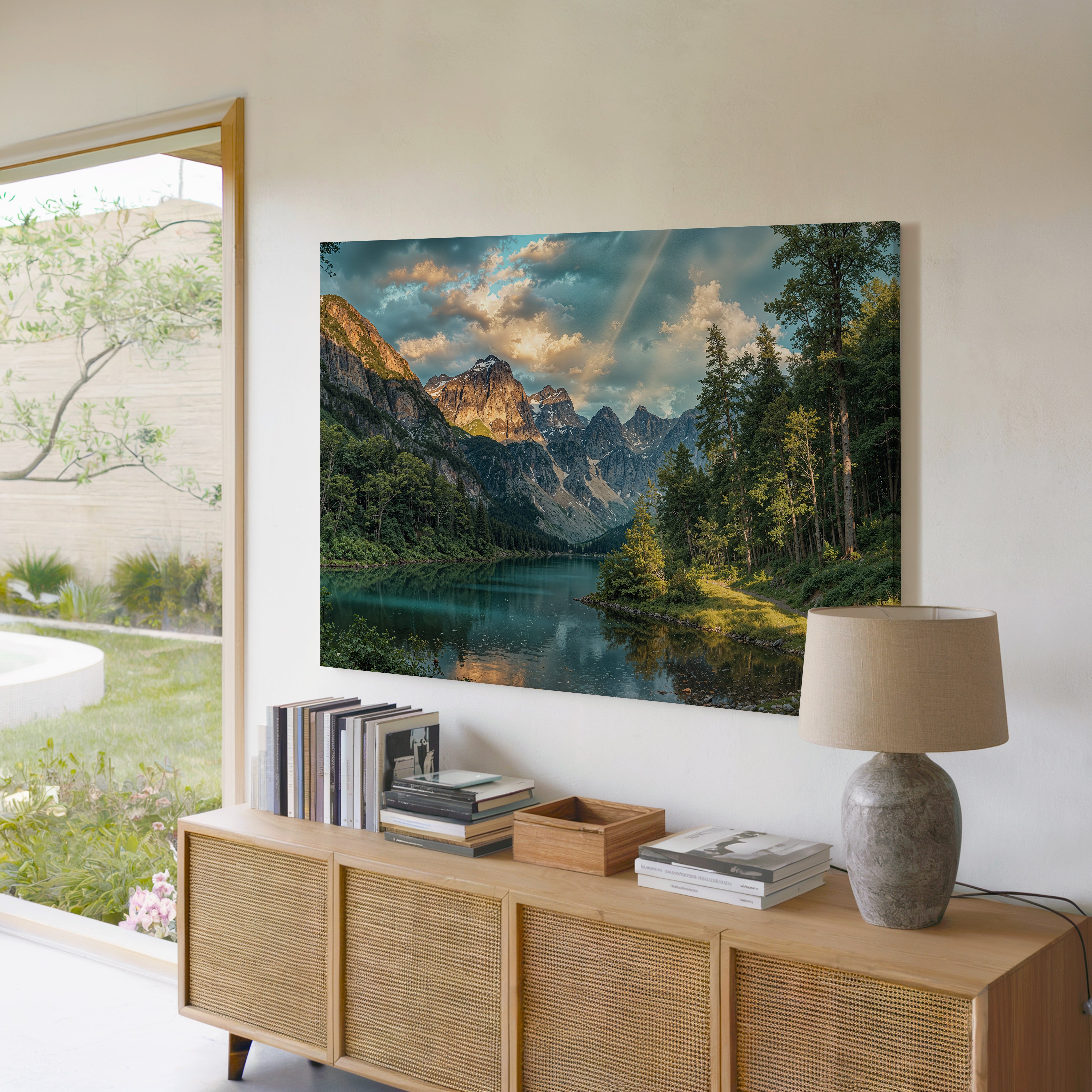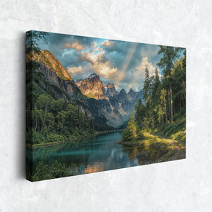 “Alpenglow Reflections and Forest Trails” captures the golden stillness of day’s end — where soft light drapes the mountain ridge, and forest paths lead quietly into mirrored waters. A luminous and earthy composition, it evokes the quiet balance between light, land, and solitude. Printed on a 1.5" gallery-wrapped canvas, this warm-toned landscape canvas print brings a sense of peace to your wall decor. Perfect for nature-inspired home decor, wall hangings, or as a thoughtful housewarming gift, it offers a grounding presence wherever it hangs.