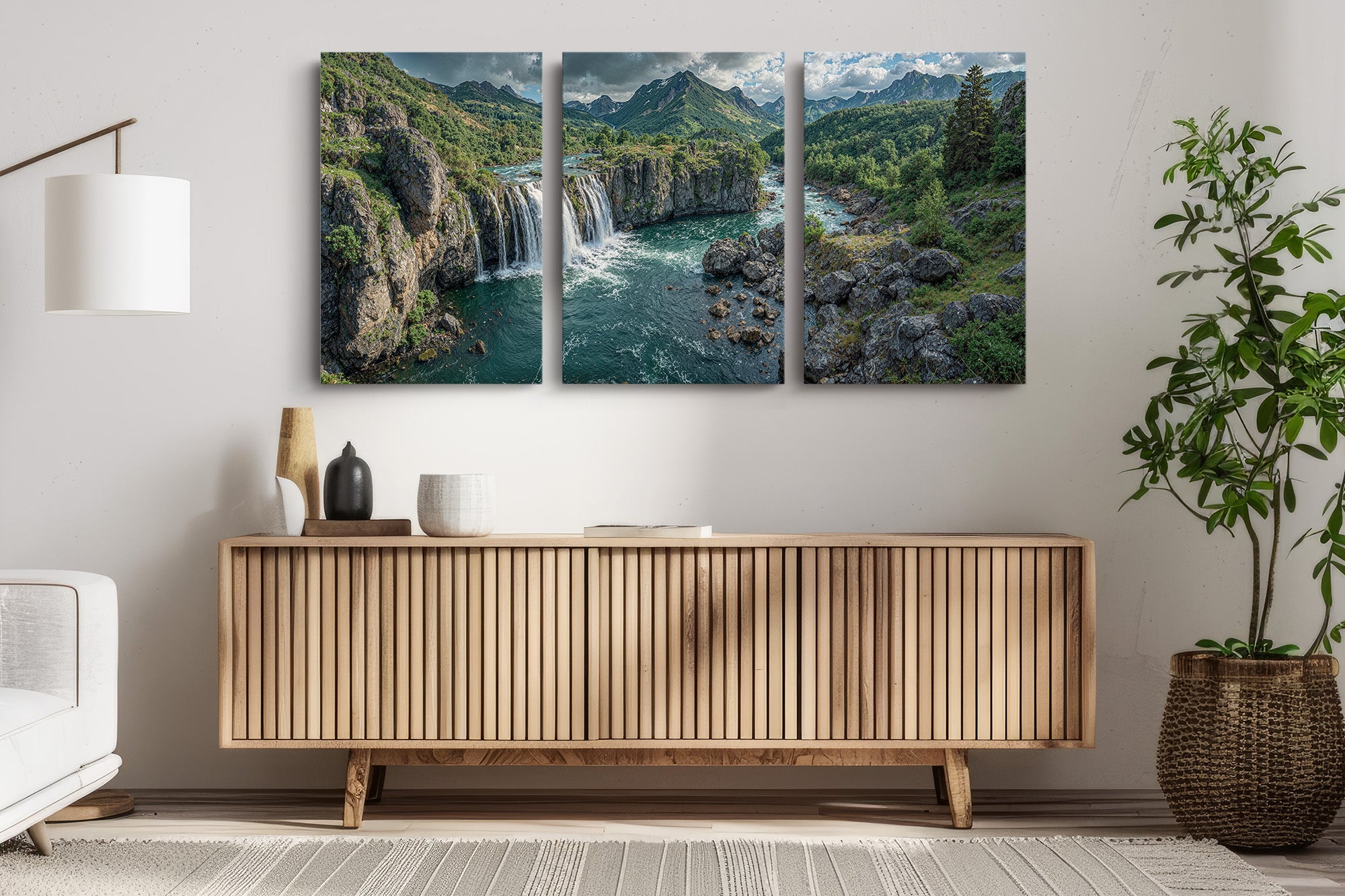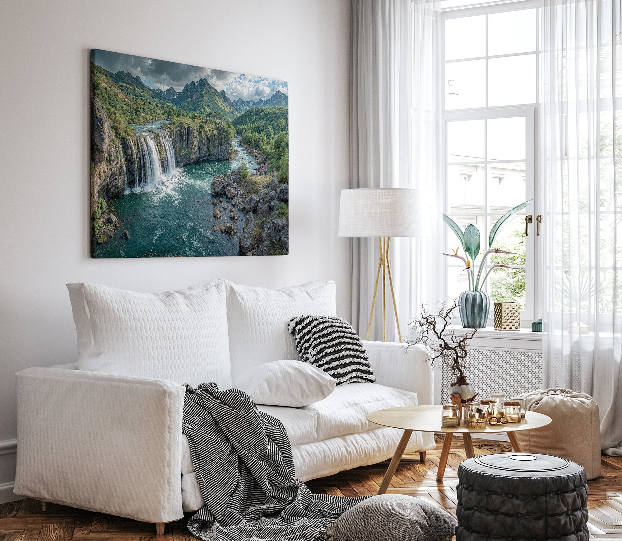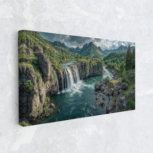 Bring the awe of nature into your space with this dramatic canvas print featuring a canyon waterfall flowing into deep turquoise waters. Towering cliffs, forested valleys, and snow-capped peaks frame the scene in rugged beauty. This landscape wall art captures the spirit of wilderness and serenity in one breathtaking view. Ideal for nature lovers and adventure seekers, this canvas print adds bold texture and color to living rooms, cabins, and offices. Available in three premium formats, each version is crafted to elevate your wall decor with gallery-quality detail.