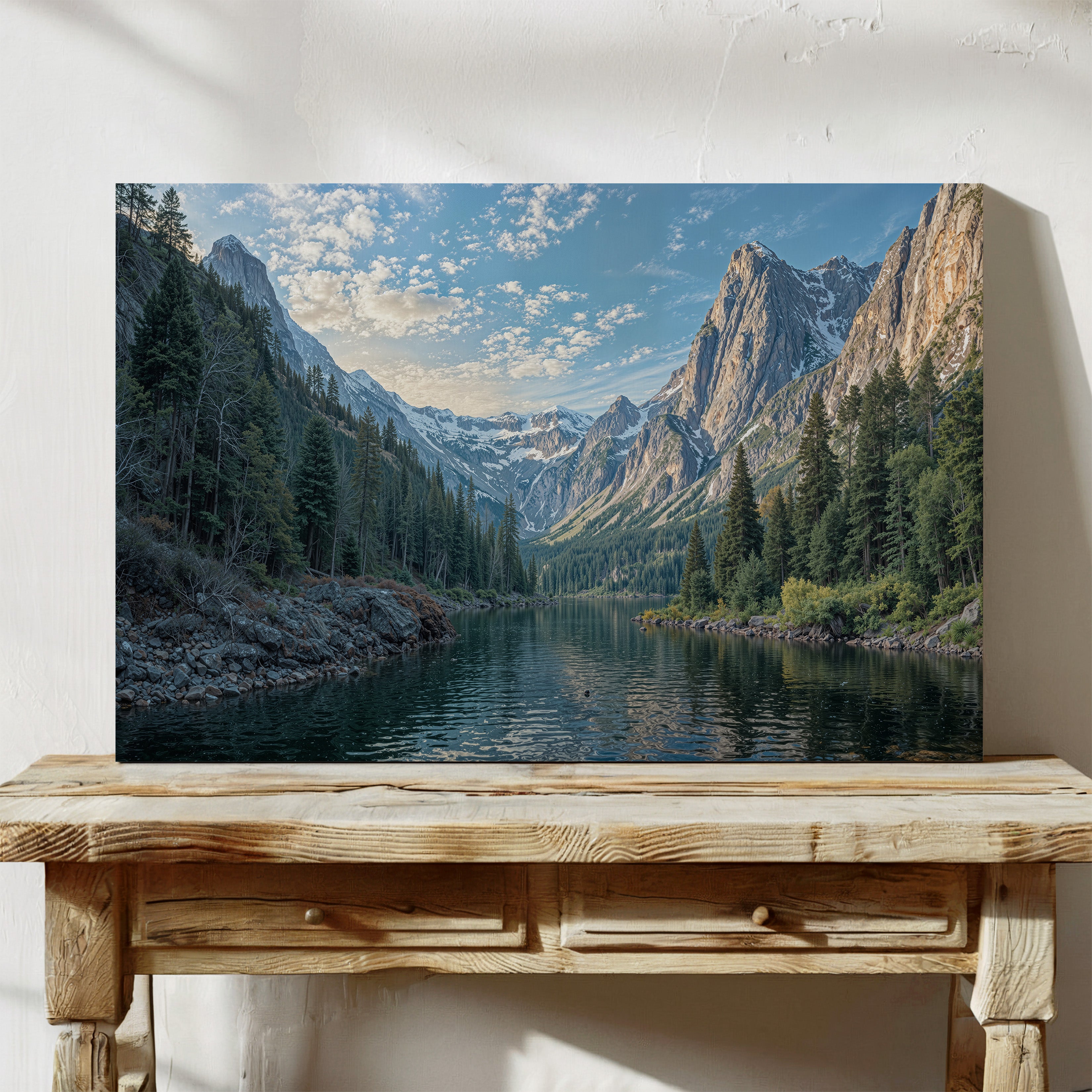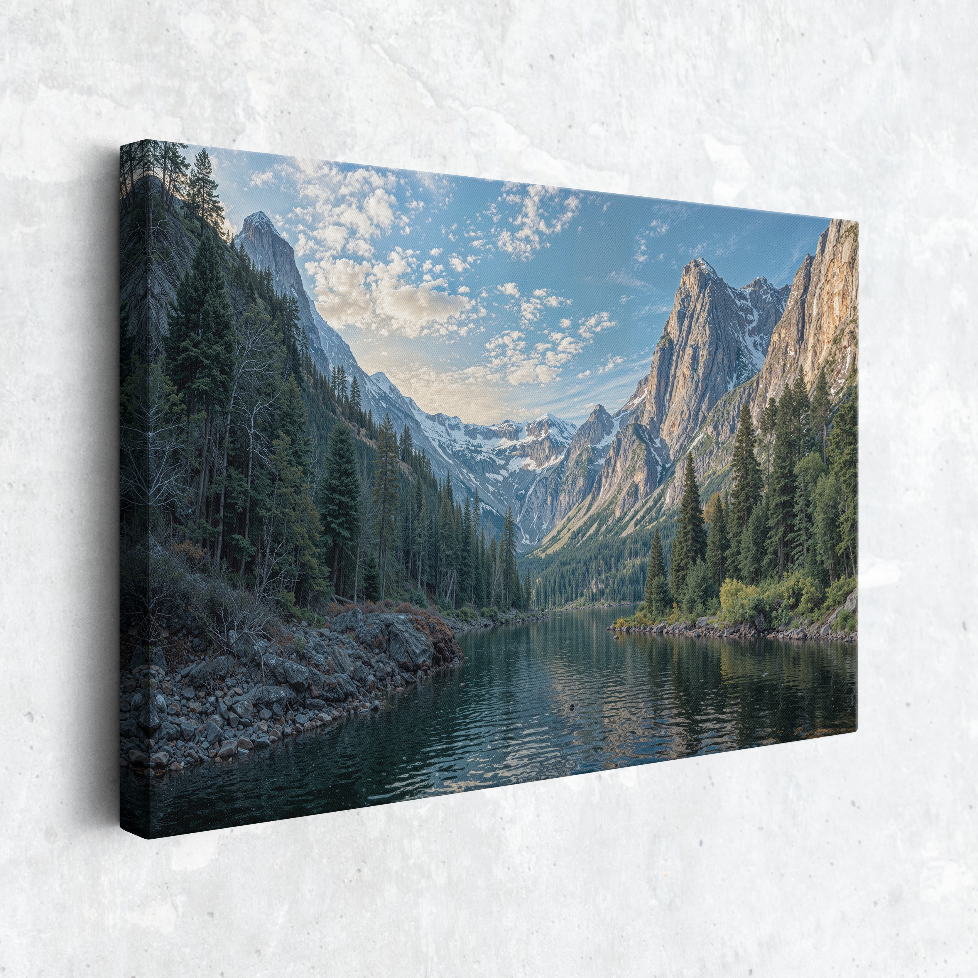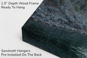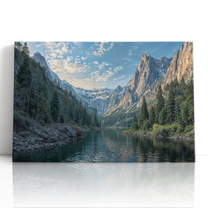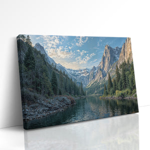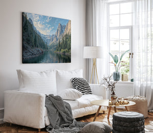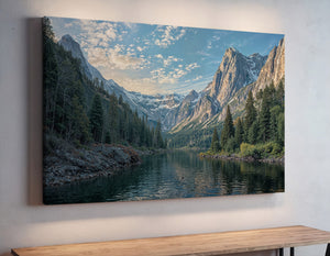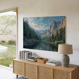Bring the grandeur of the wilderness indoors with this breathtaking canvas print of a snowy mountain lake. Towering pine trees line the shore as dramatic alpine peaks rise in the distance, reflecting peacefully in the cold, still water. Crisp blue skies and detailed textures give this artwork a powerful sense of realism and calm. Perfect for cabin decor, rustic interiors, or lovers of mountain landscapes, this gallery wrapped canvas captures the raw beauty of nature. A striking piece of wall art that adds depth and serenity to any space.