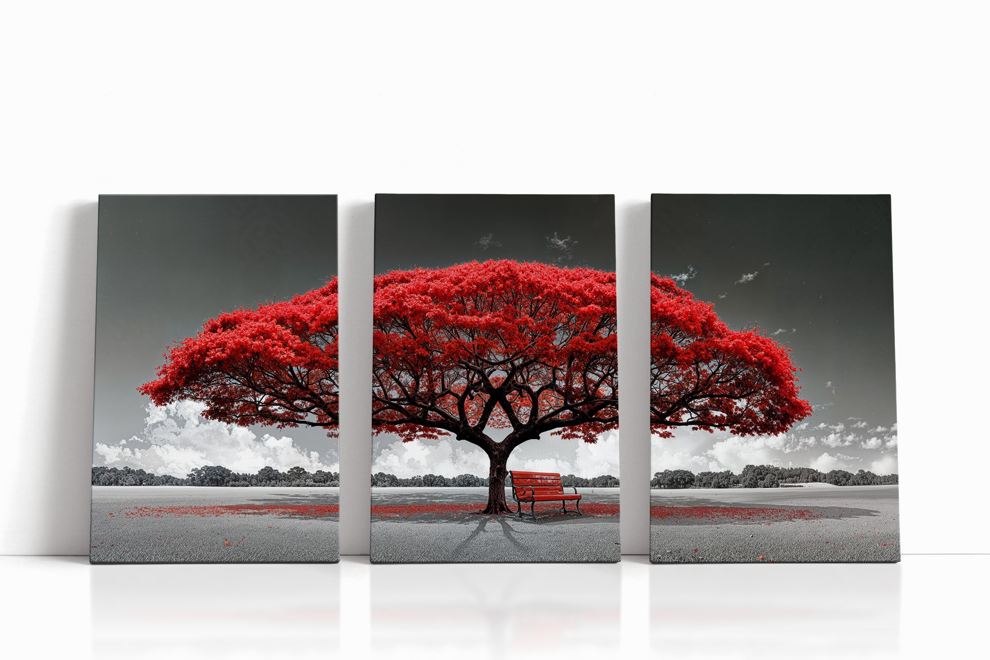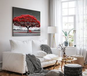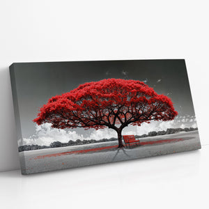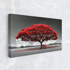 Bring a dramatic touch of contrast and solitude to your walls with this striking canvas print. A bold red tree blooms brilliantly against a grayscale landscape, with a solitary bench beneath its canopy offering a quiet moment of reflection. The surreal color palette blends emotional stillness with visual impact — ideal for minimalist, modern, or symbolic decor. Whether displayed in a living room, hallway, or office, this wall art delivers elegance, contemplation, and a pop of vivid intensity. Choose from multiple premium display formats to suit your interior style.