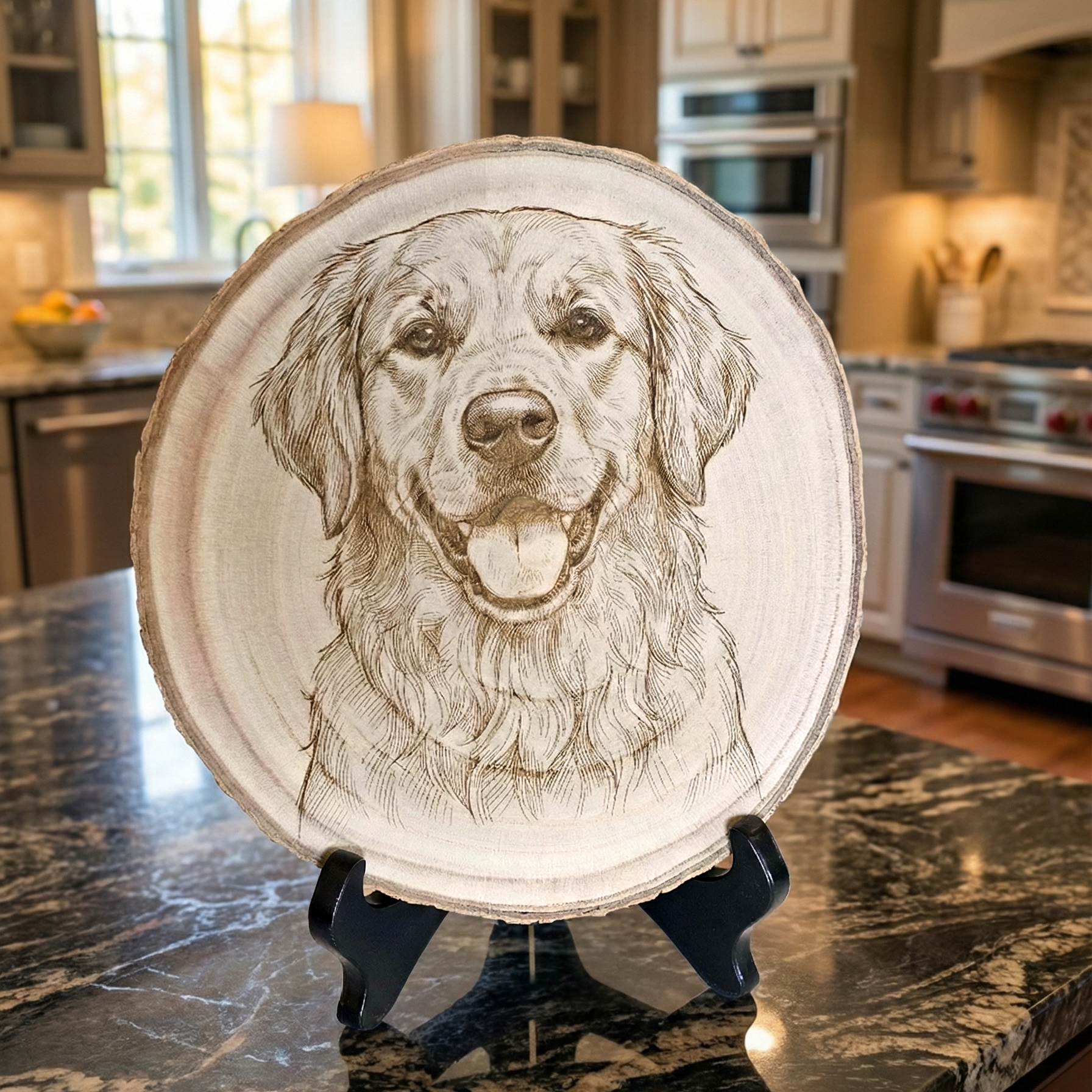 Your photo is transformed into a highly detailed sketch to be engraved in a wooden tree slice. We will send you an engraving preview for your approval before we begin engraving.
