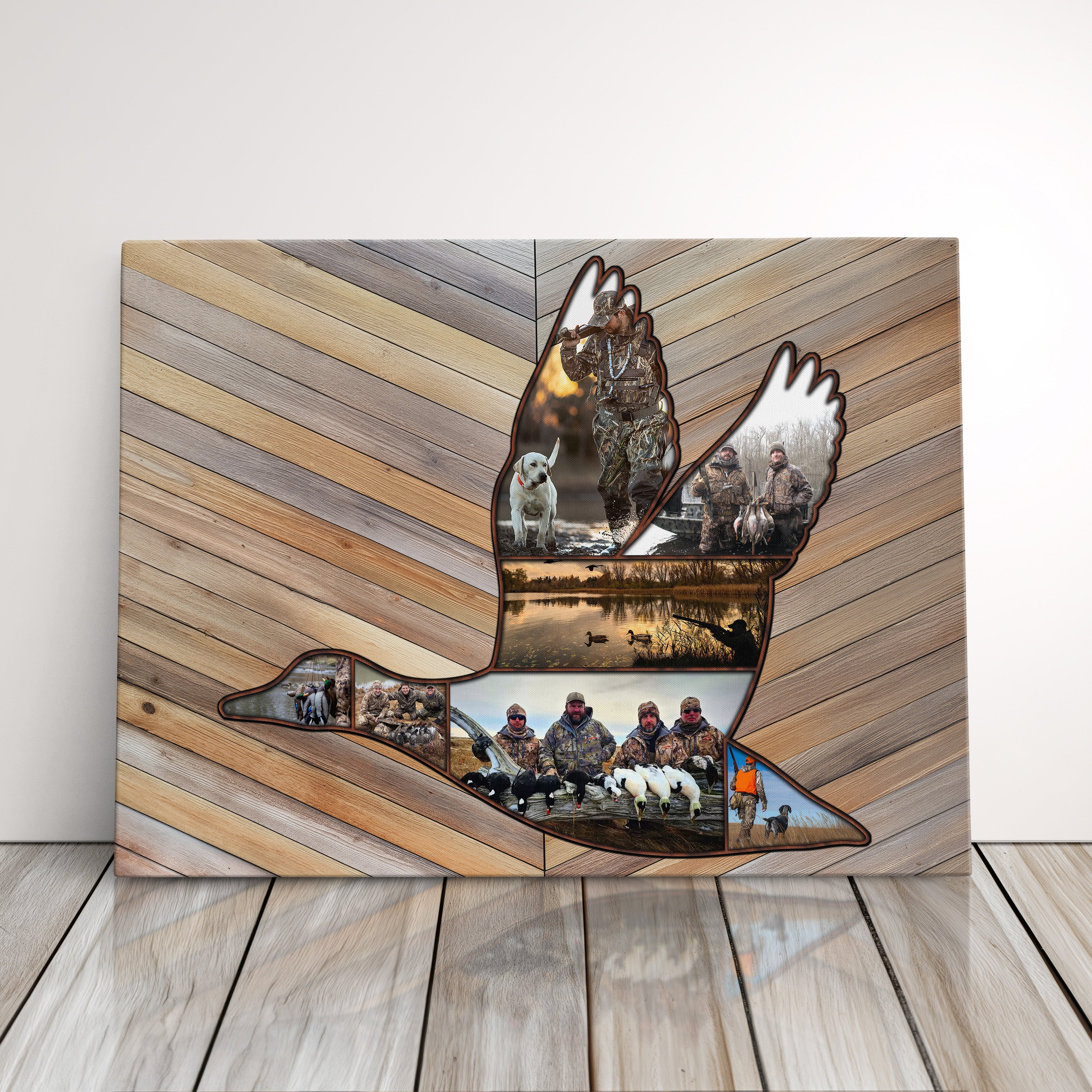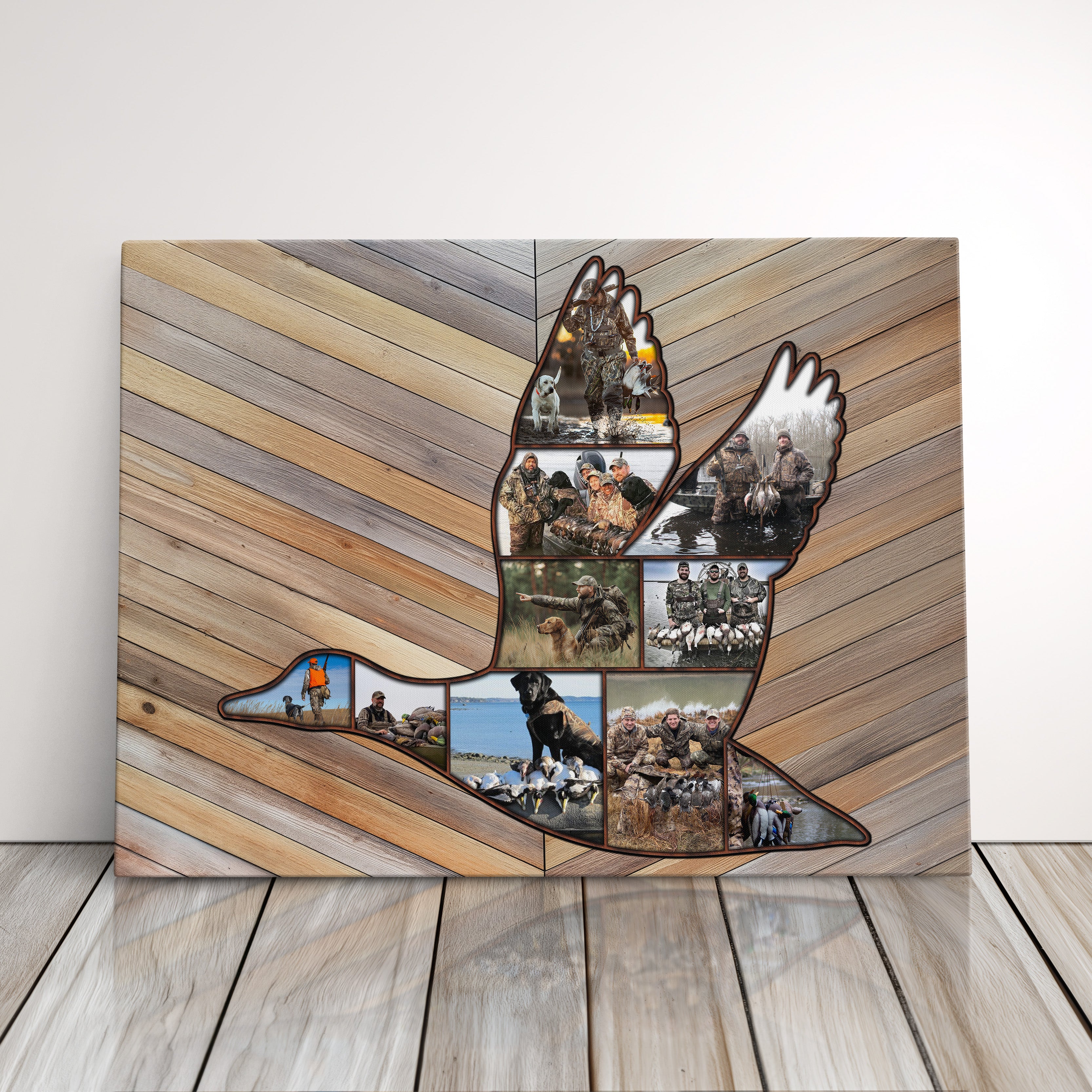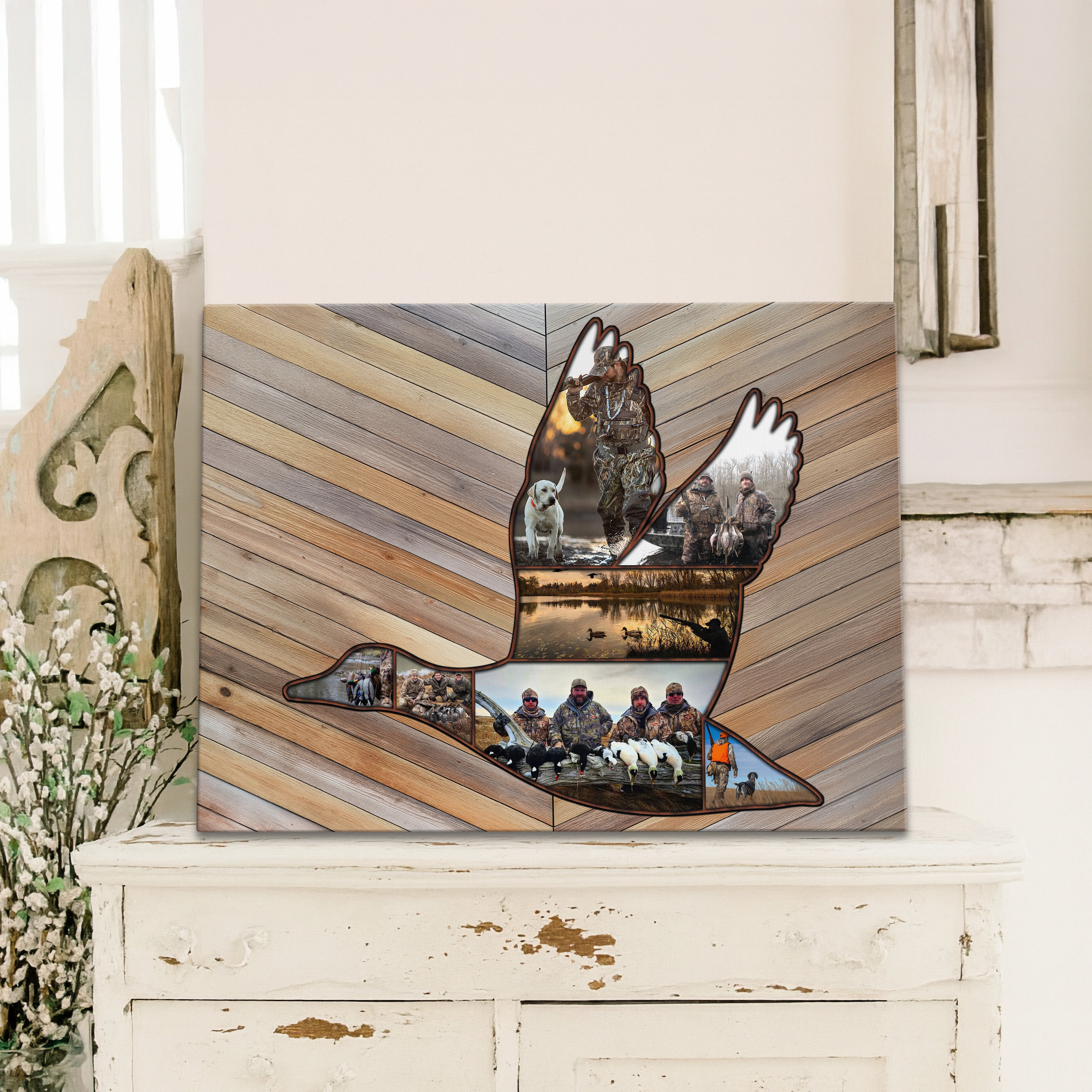 Give the ultimate hunter’s gift with this Personalized Duck Hunting Canvas Print — a custom photo collage in the shape of a flying duck, created for those who live for mornings in the blind and memories in the marsh. Whether you're honoring a father, husband, or best hunting buddy, this makes the perfect gift for him.