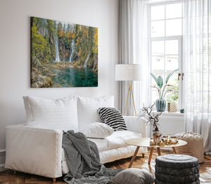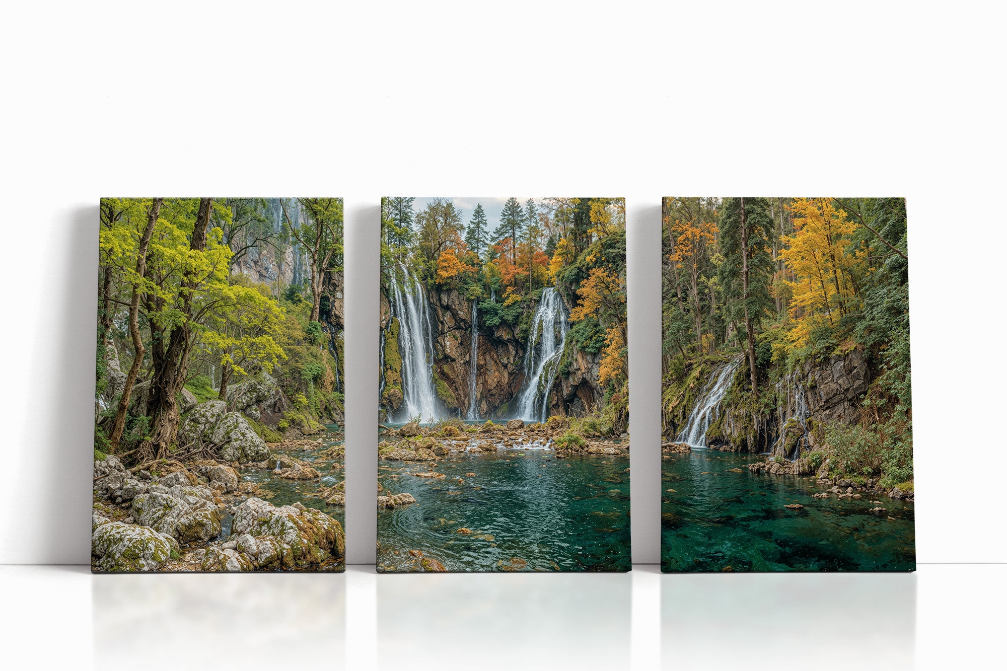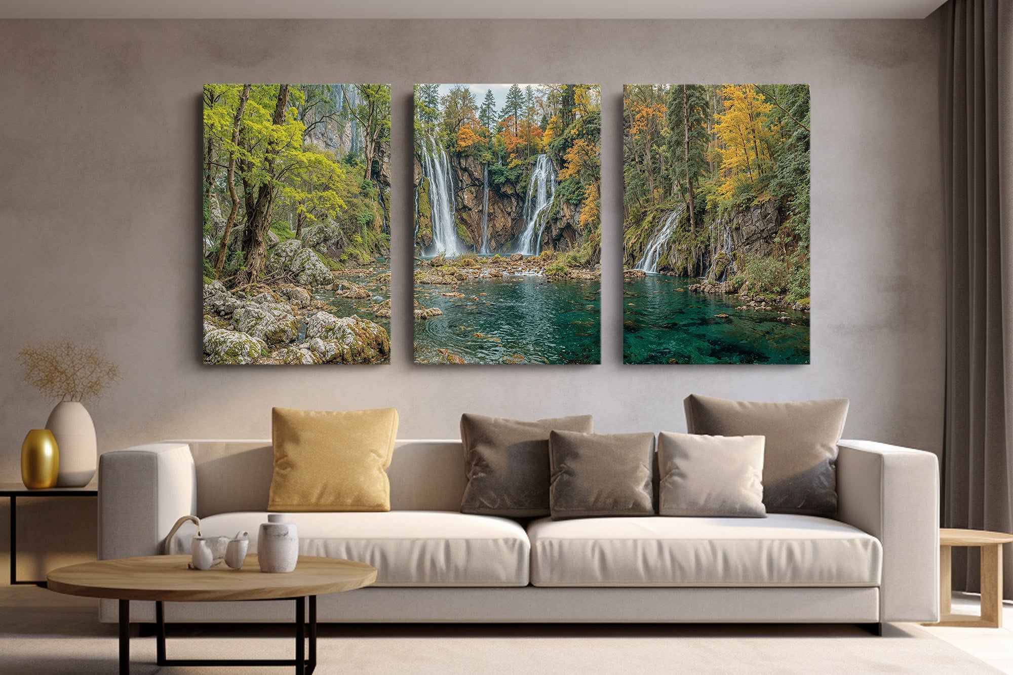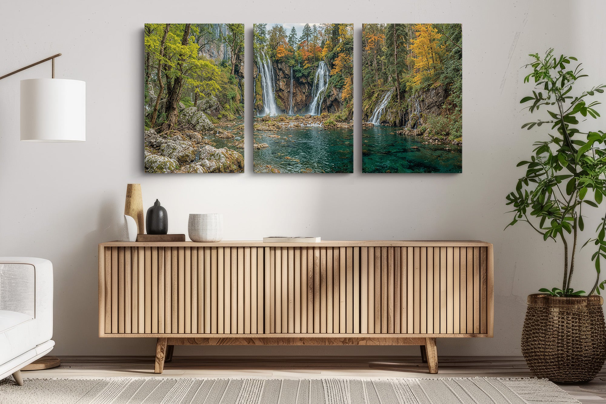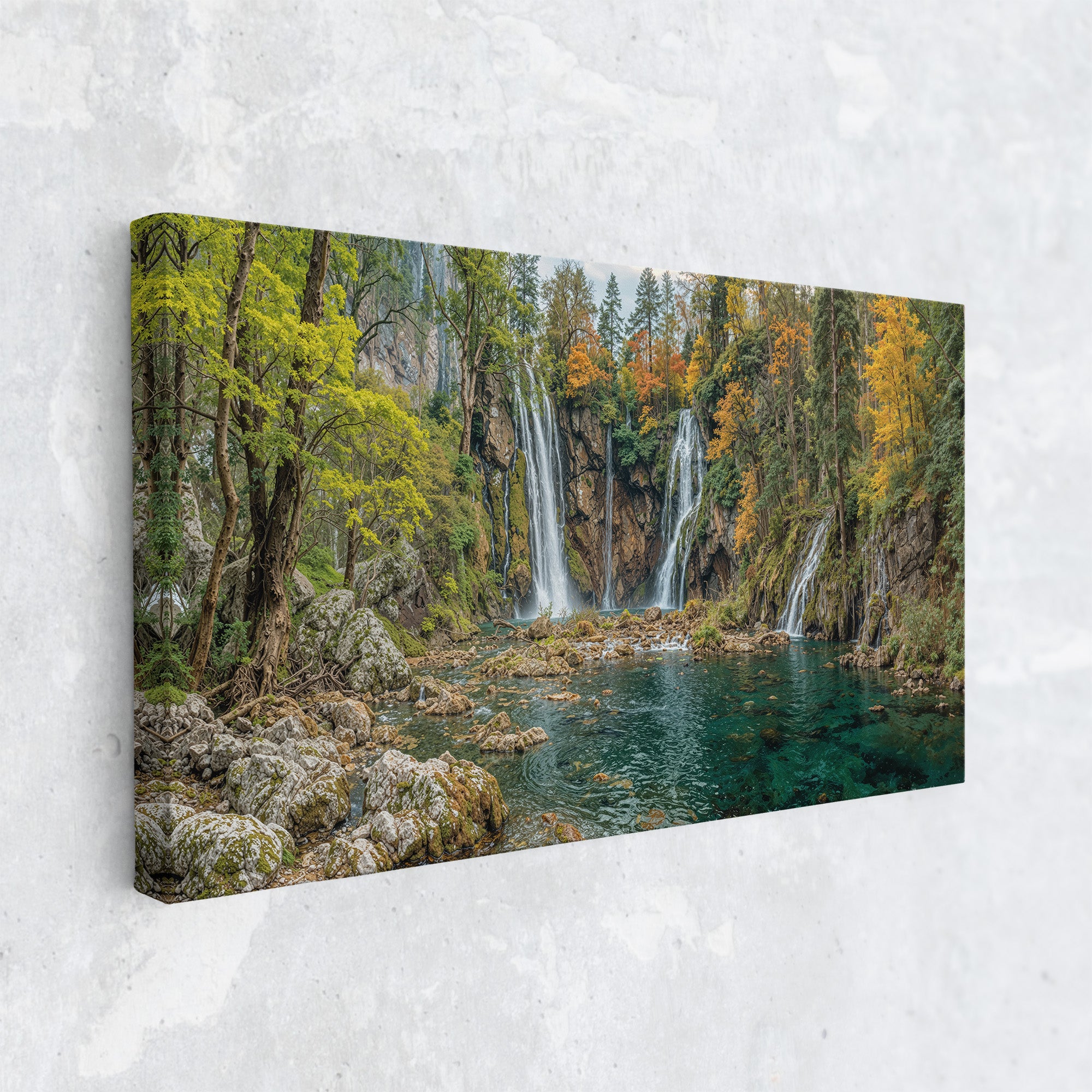 Step into a hidden autumn sanctuary where vivid foliage surrounds cascading waterfalls and moss-covered cliffs. This breathtaking canvas print captures the essence of nature’s gentle rhythm — where golden trees whisper above streams that tumble into turquoise pools. Perfect for lovers of woodland scenery, this tranquil forest and waterfall landscape brings a peaceful, refreshing energy into any space.