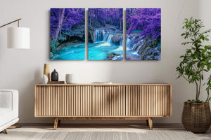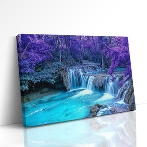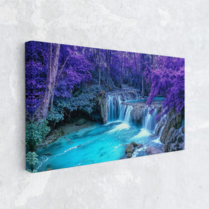 This surreal landscape immerses you in a forest of vibrant violet foliage surrounding a cascading waterfall that pours into a radiant turquoise pool. Dreamlike and enchanting, this fantasy-inspired scene evokes a magical tranquility — as if from another realm. A stunning conversation piece for any room, this canvas print transforms ordinary decor into something extraordinary, blending nature’s serenity with otherworldly flair.