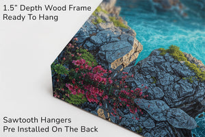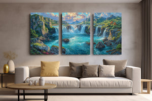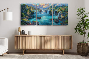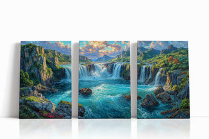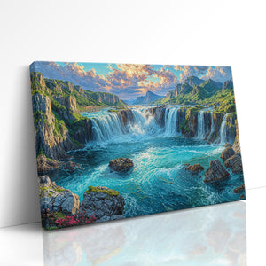 Roaring cascades surge through a lush canyon, framed by towering cliffs and forested slopes glowing under golden skies. This vivid mountain river landscape captures the raw power of water and the quiet strength of stone, surrounded by rich greenery and dramatic lighting. Ideal for nature lovers and perfect as statement wall decor in living rooms, bedrooms, or office spaces.